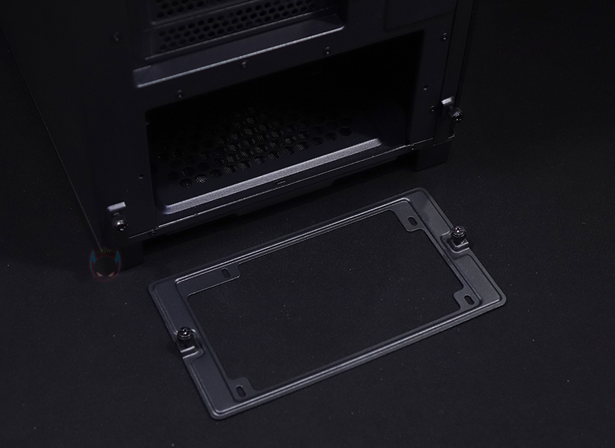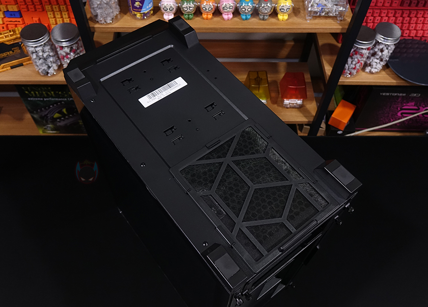 외형 끝으로, 케이스 밑바닥을 살펴보면 앞뒤로 약 21.5mm 높이의 받침대가 적용되어 있으며, 진동소음 최소화를 위해 고무패드도 기본 부착되어 있죠. 또한, 내부에서 확인하겠지만, 앞자리에는 내부 HDD 베이를 위치 이동할 수 있게 처리되어 있으며, 뒤쪽 파워서플라이 자리에는 분리형 먼지필터가 적용되어 있는데, 필터를 분리하면 역시 파워서플라이 쿨링효과를 위해 에어홀이 처리된 것을 확인할 수 있죠.