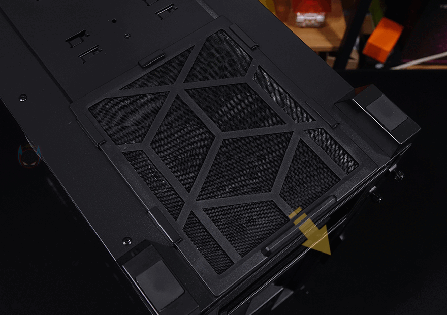 그리고, P20C ELITE 6FAN 케이스 상단에는 앞부분 맨 오른쪽에 버튼 및 포트가 배치되어 있는데, 전원/리셋/LED램프/USB 3.0/오디오/마이크/USB 3.0/USB 3.2 C타입 순으로 배치되어 있습니다. 그리고, 상단 역시 먼지필터가 자석방식으로 부착되어 있는데, 분리하면 상단 쿨링시스템을 갖출 수 있게 에어홀과 나사홀이 적용된 것을 확인할 수 있으며, 팬 기준으로는 120/140mm 모두 최대 3개까지 장착이 가능하고, 수랭쿨러 사용 시 전면과 동일하게 360mm 라디에이터까지 장착이 가능하죠.