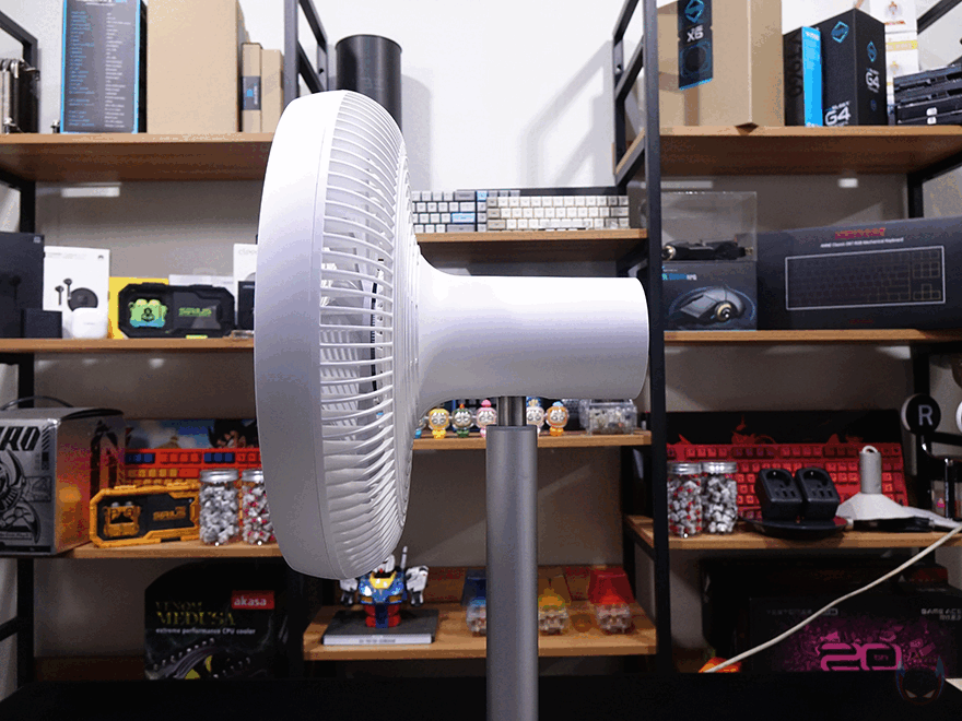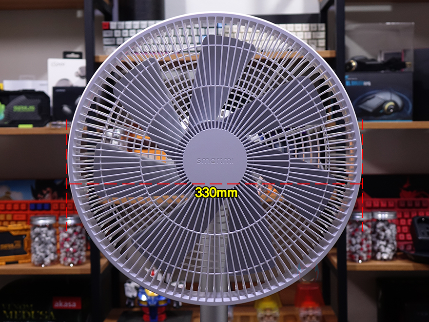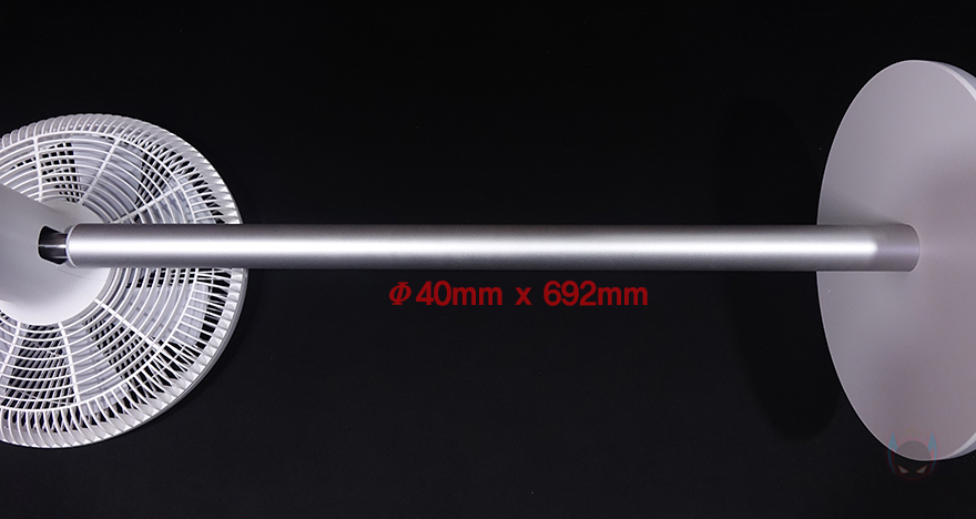 그럼, 조립된 스마트미 2S 무선 선풍기를 살펴보는데, 높이는 선풍기 팬 수평 기준으로 받침대부터 팬 맨 윗부분까지 960mm 길이를 가지고 있습니다. 그리고, 팬 지름도 앞서 확인한 아래 받침대와 동일하게 330mm 크기를 가지고 있죠. 팬 커버 전면에는 심플하게 로고(Logo)만 새겨져 있으며, 선풍기 후면 그러니깐 모터쪽에는 후면에는 좌우 회전 버튼이 배치되어 있고, 모터 상단에는 전원 버튼과 작동과 충전 상태를 확인할 수 있는 LED 인디케이터가 배치되어 있습니다. 그리고, 스탠드는 알루미늄 소재로 지름 40mm에 길이 약 692mm를 가졌으며, 모터와 스탠드 연결부는 회전과 상하 각도조절이 되는 부분으로 상하 각도조절은 수평 기준에서 위로 25˚, 아래로 15˚로 총 40˚ 범위를 가지고 있습니다.