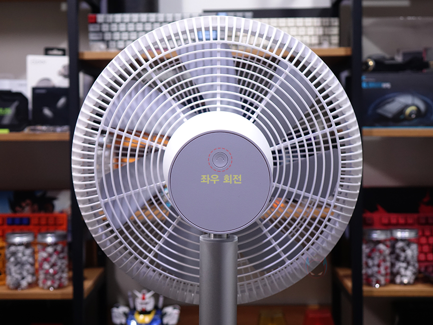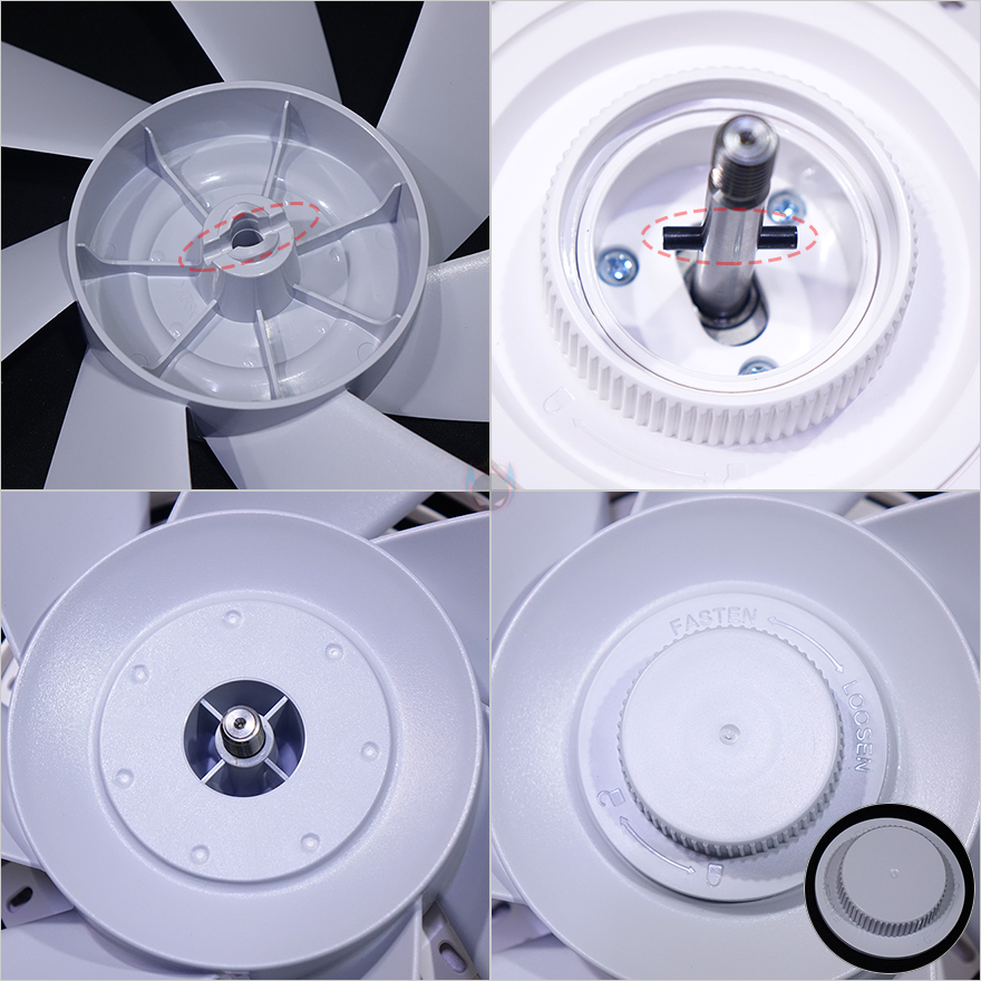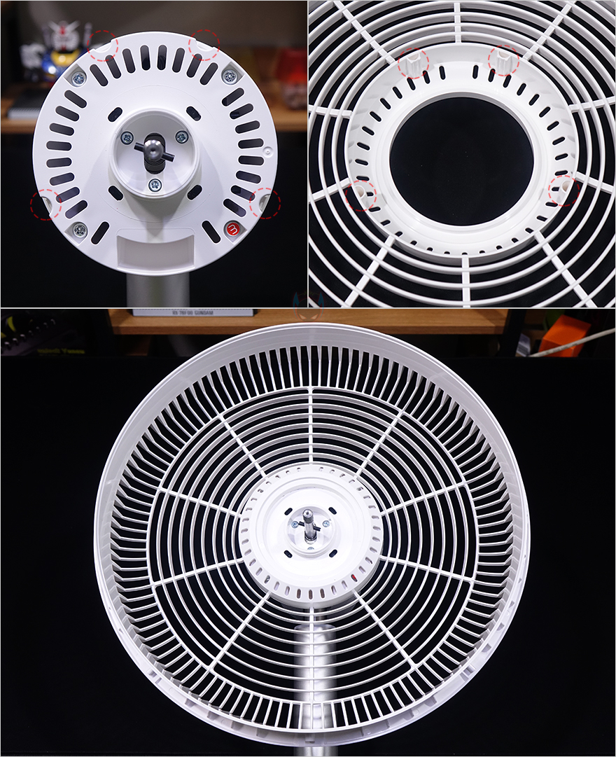 이제 팬 커버 내부에 팬 날개를 장착해줘야하는데, 일단 커버 윗부분에 표시된 분리향으로 커버를 돌리면 쉽게 앞뒤가 분해가 됩니다. 그러면, 내부에 장착되지 않은 팬 날개의 포장 종이까지 벗기면 총 3개 구성인데, 먼저 팬 커버의 뒷면을 모터 방향에 맞춰서 끼운 후, 팬 커버 고정 노브로 체결해 줍니다. 그리고, 팬 날개를 역시 모터 회전축과 홈에 맞춰서 끼운 후, 팬 날개 고정 노브로 체결해 주고, 최종적으로 팬 커버 앞면을 다시 끼운 후, 커버 아래쪽에 고정 나사로 잠그면 모든 조립이 마무리됩니다. 일반적인 선풍기 조립과 다르지 않아서 큰 어려움은 없습니다.
