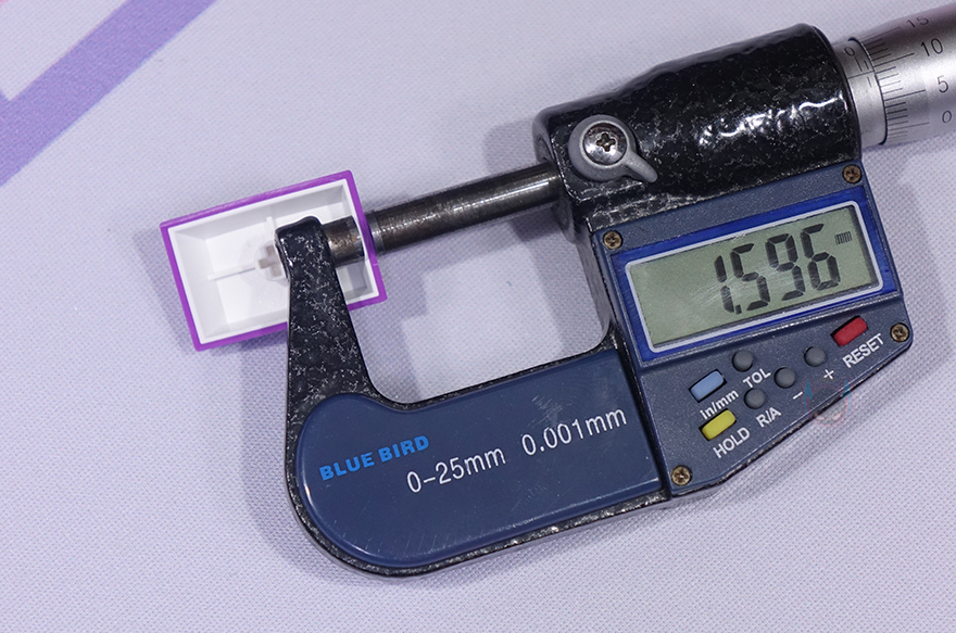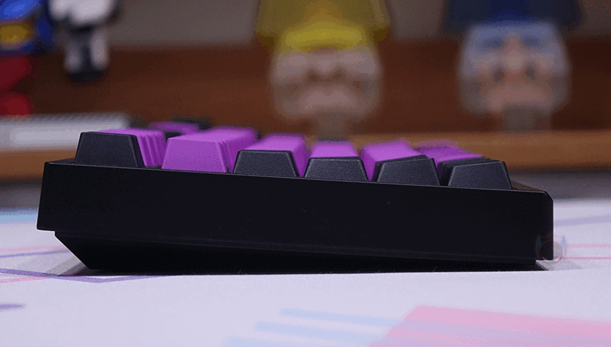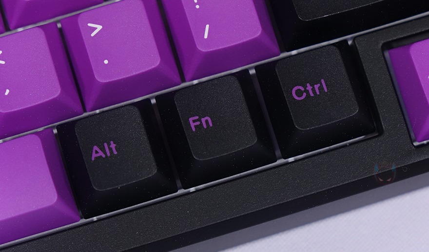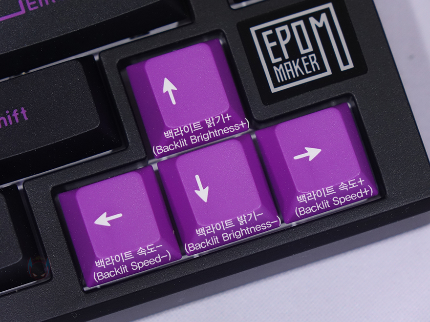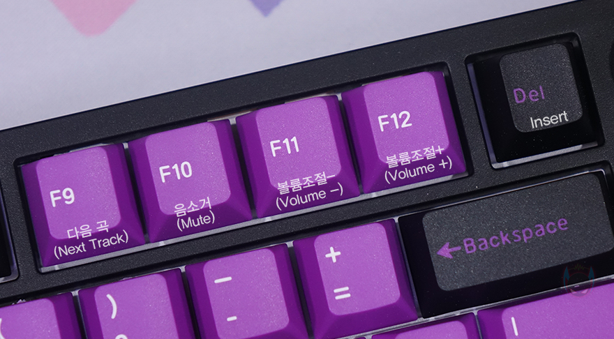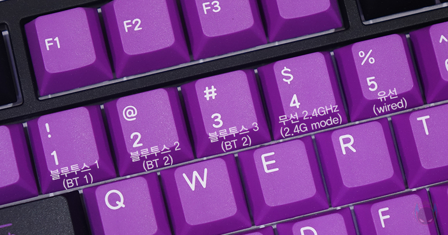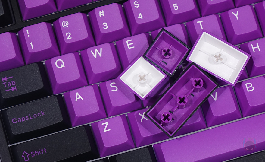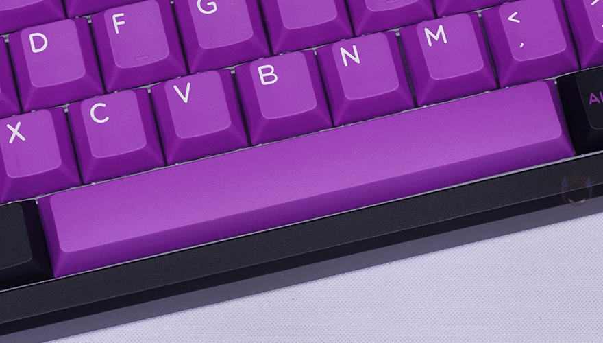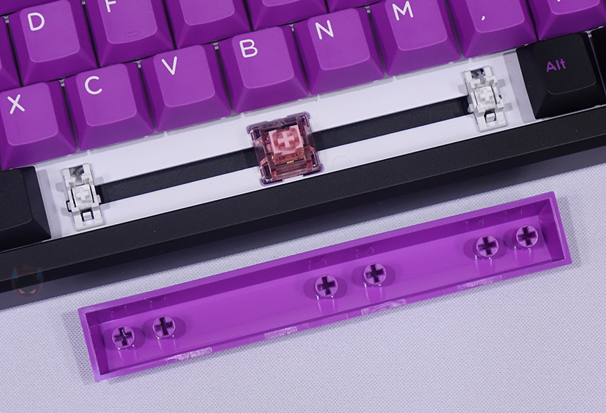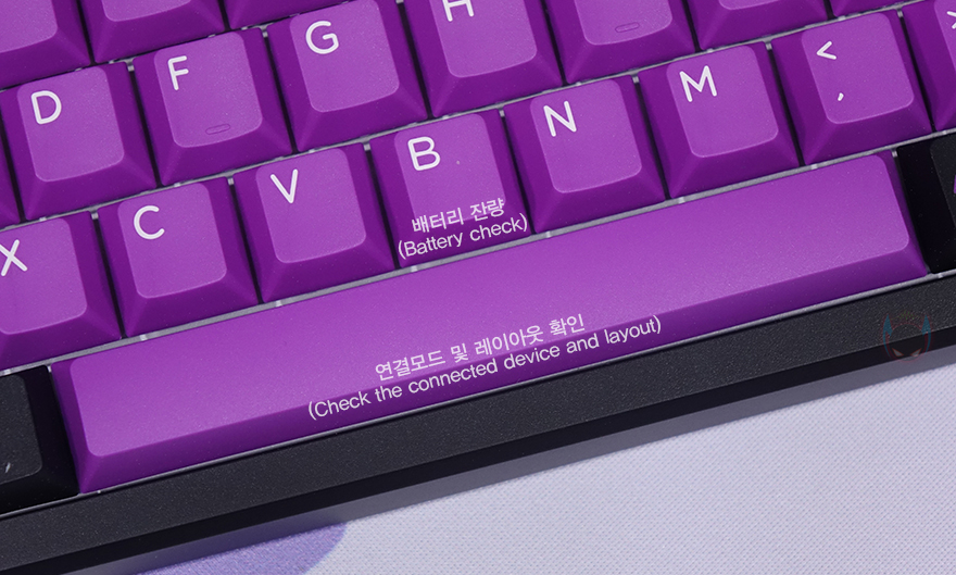 키-캡은 앞서 언급했듯이 제품 색상에 따라 블랙과 퍼플 투톤 컬러로 적용되었는데, 재질은 PBT 재질이고 이중사출 방식으로 처리했는데, 안쪽도 100% 채워진 상태라 키-캡 두께가 약 1.6mm로 두껍습니다. 참고로, 백라이트가 투과되지는 않습니다. 그리고, 앞서 구성품에서 확인했던 추가 교체용 검은색 스페이스-바로 교체해서 사용할 수 있고, 스테빌라이저는 체리식입니다.