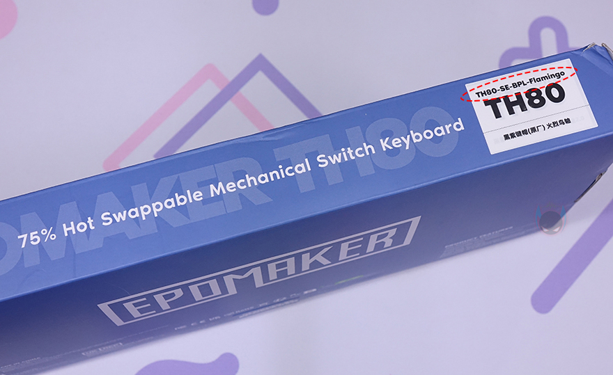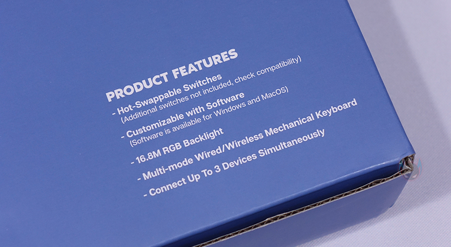 EPOMAKER의 키보드는 제품 박스가 심플한게 특징이죠. TH80 SE 역시 자사의 다른 제품들처럼 단색 배경 그러니깐 블루 색상 배경에 전면에는 해당 키보드의 윤곽 이미지와 모델명만 담고 있습니다. 측면에는 맨 오른쪽에 모델명 위에 스위치 표기를 해놨죠. 그리고 , 박스 후면에는 간단하게 중앙에 로고(Logo)와 오른쪽 아래에 제품의 주요 특징만 표기해놨습니다. 주요 특징으로는 핫-스왑 스위치(Hot-swap switch), 사용자정의 소프트웨어(Customizable with software), RGB 백라이트(RGB backlight), 유무선(wired/wireless) 지원, 3 디바이스(Devices) 연결 지원을 언급해 놨습니다.
