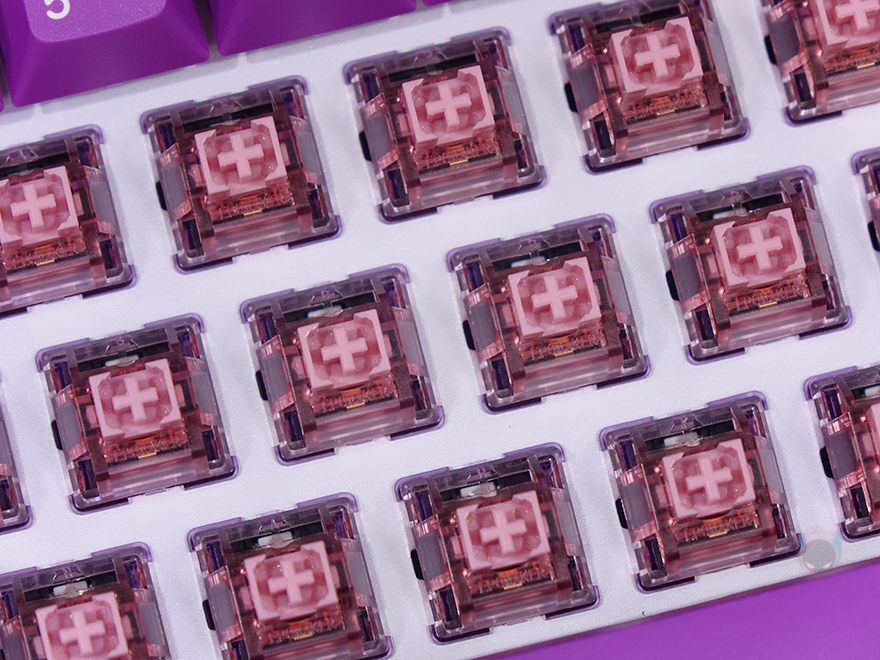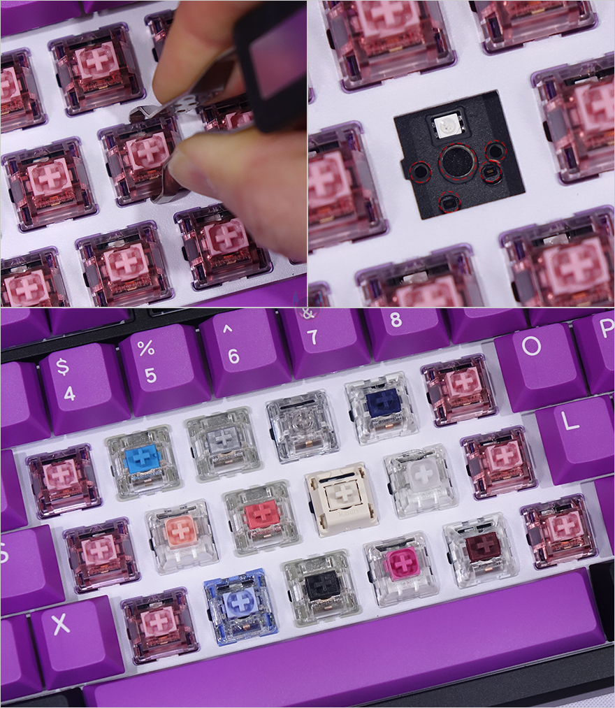 스위치는 TH80 SE 키보드에서 총 5가지 스위치 중 사용자가 선택할 수 있는데, 3가지는 EPOMAKER의 커스텀 스위치(custom switch)로 Flamingo/Budgerigar/Bluebird, 나머지 2개는 게이트론(Gateron)의 G Pro 스위치입니다. 리뷰에선 커스텀 스위치이자 리니어 타입인 Flamingo 스위치로, 상/하판 모두 반투명 컬러를 적용하고 있으며, 작동력(Actuation force) 47 ± 5gf, 초기 압력(Initial force) 35gf, 총 이동거리(Total Travel)는 3.80mm로 체리 기준의 적축 스위치보다 좀 더 가볍게 만들었습니다. 그래서, 스프링도 이중으로 적용되어 있죠. 물론, 스위치는 핫-스왑(Hot-swap) 방식이고 PCB기판에 구멍이 5개라 3pin과 5pin 스위치 모두 호환 사용이 가능합니다.
