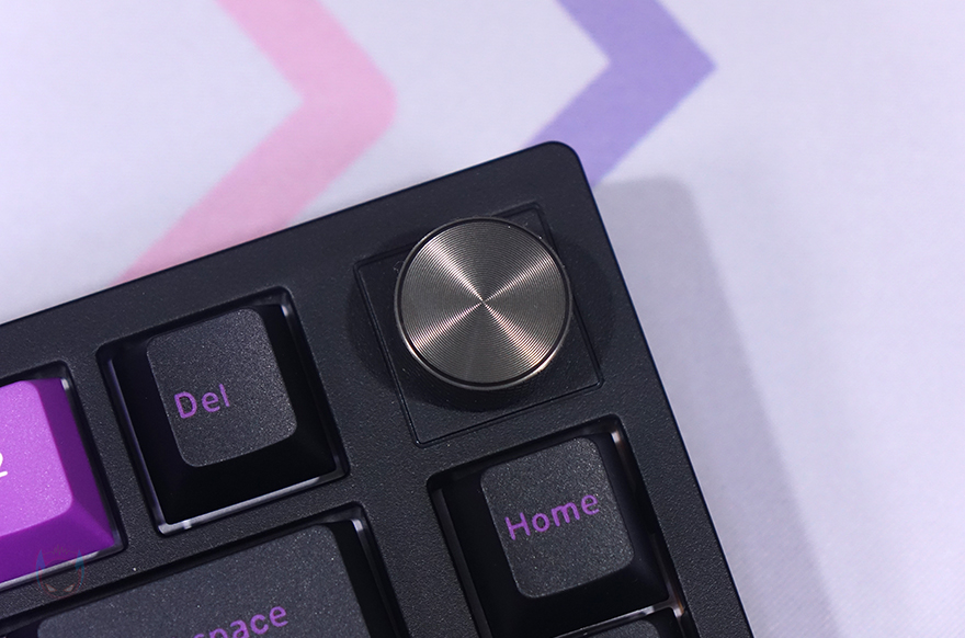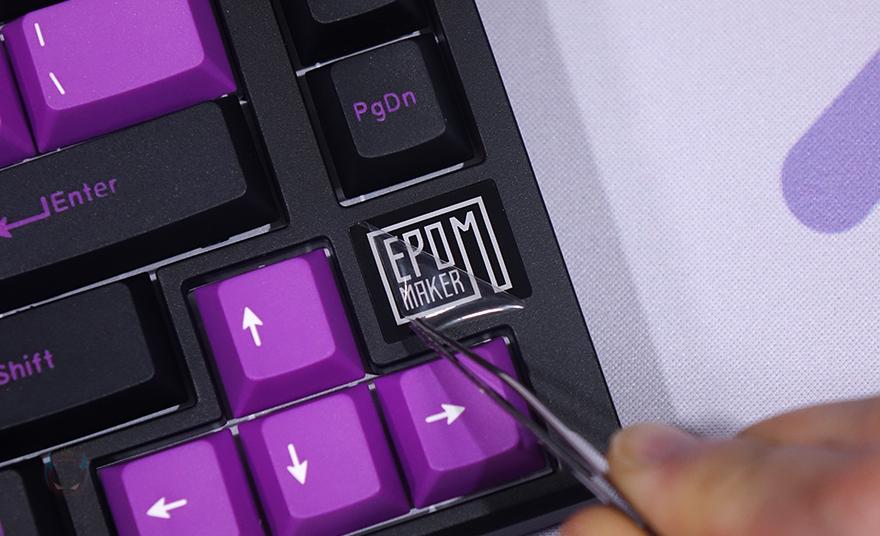 그리고, 총 키수는 81 키(key)로 텐키리스보다 조금 작죠. 하지만, 엔터키까지 기본 배열을 유지하면서 맨 오른쪽에 일부 특수키와 방향키를 담고 있습니다. 물론, TH80 series의 대표적인 상징이라 할 수 있는 노브(Knob)도 적용되어 있습니다. 특히, 이번 TH80 SE의 노브 같은 경우에는 기존 제품과 달리 메탈 소재 그대로 감성을 살리고 있죠. 또한, 뒤에서 확인하겠지만, 방향키 옆에 배치된 EPOMAKER 로고(logo)는 키 스위치들의 조명과 동일하게 조명효과를 볼 수 있습니다. 물론, 개봉 시에는 보호비닐도 부착되어 있죠.