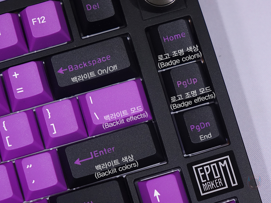 TH80 SE 키보드 역시 Fn키 조합으로 부가 기능들을 지원해주고 있습니다. 먼저 백라이트(Backlight) 기능은 백스페이스로 On/Off 할 수 있으며, \키로 모드(Effects) 전환, Enter키로 색상(Color) 변경을 할 수 있죠. 그리고, 바로 오른쪽에 배치된 일부 특수 키들 역시 Fn키 조합으로 아래 로고 배지(Badge) 조명을 조절할 수 있는데, Home키는 색상변경, PageUp키는 모드 변경입니다. 그리고, 아래에 PageDown키는 담지 못한 특수키 End키로 사용할 수 있죠. 물론, 백라이트의 밝기조절과 속도조절 각각 상하(↑↓) 방향키와 좌우(←→) 방향키로 조절됩니다.