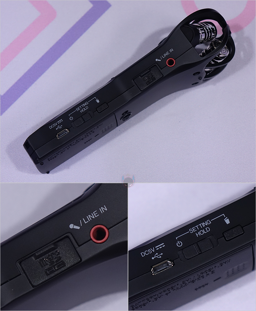 이 외에도 마이크 오른쪽 측면에는 외부 마이크를 연결해서 사용할 수 있게 Line In 포트가 있는데, 이때는 H1n이 일종의 오디오 인터페이스 역할을 하게 됩니다. 그리고, 그 아래에는 마이크로 SD/SDHC 메모리 카드를 삽입하는 공간이 있으며, 아랫쪽에는 전원/녹음버튼 잠금을 할 수 있는 스위치, 파일삭제 버튼, 그리고 외부 보조배터리를 연결할 수 있게 마이크로 5pin USB 포트가 배치되어 있죠. 반대쪽 측면에는 녹음 상태를 모니터링할 수 있게 헤드폰 3.5mm 포트가 배치되어 있으며, 아래에는 볼륨 조절 버튼이 적용되어 있습니다.