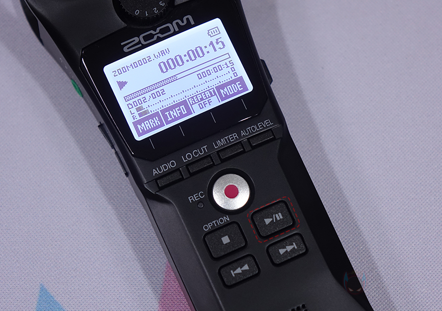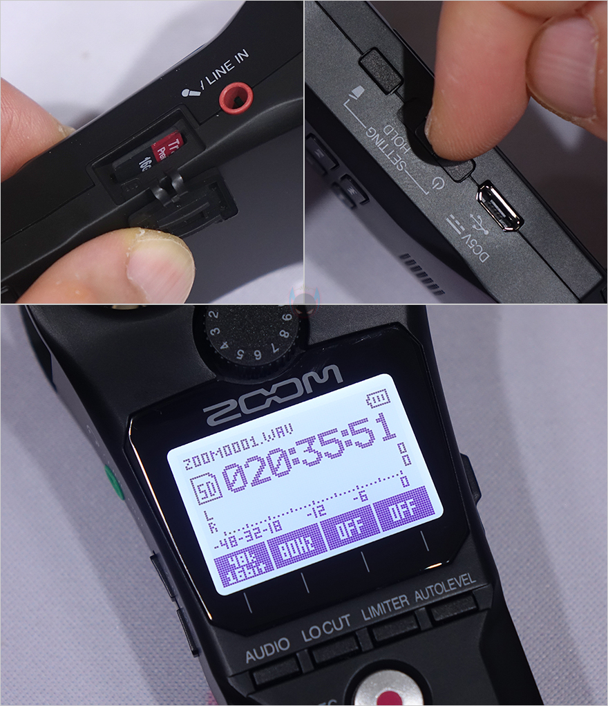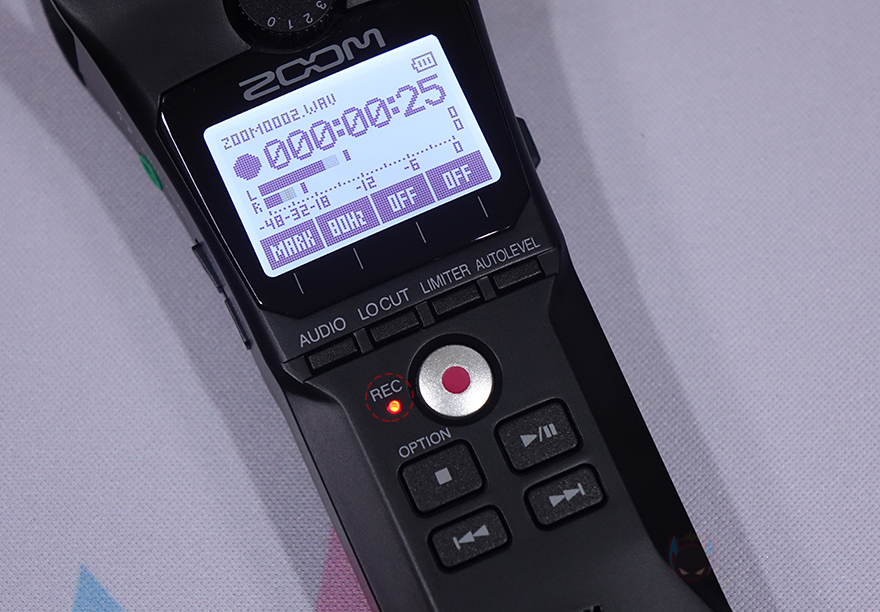LCD 화면 아래에는 녹음 전 오디오 파일 설정을 할 수 있는데, WAV 파일로 44.1kHz/16비트, 48kHz/16비트, 48kHz/24비트, 96kHz/24비트로 저장할 수 있으며, MP3 파일로 48/128/192/256/320kbps로 저장할 수 있습니다. 그리고, 바로 옆에는 주변 소음을 감소시켜 주는 로우-컷(Low-cut) 버튼이 있는데, Off/80/120/160Hz 4단계로 조절할 수 있으며, 그 옆으로는 리미터 On/Off와 자동레벨 On/Off 버튼이 있죠. 자동레벨을 활성화시키면, LCD 위에 배치된 노브를 따로 조절 할 필요 없습니다. 설정이 끝나면, 바로 아래 녹음 버튼을 누르면 바로 녹음 모드가 시작되고, 옆에 LED 인디케이터도 레드(Red) 색상으로 점등되죠. 그리고, 녹음을 끝낼 때는 녹음 버튼을 다시 누르면 됩니다.