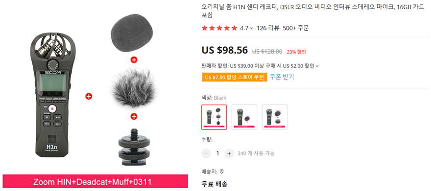 끝으로, 앞서 시작에서 언급했듯이 이번에 ZOOM H1n 마이크를 살펴보는 이유는 여전히 가성비로 인정받는 제품인만큼 소비자입장에선 이용이면 저렴하게 구입하면 더 좋은 것이기 때문에, 최근 한국 소비자들이 알리익스프레스를 많이 사용하고 있어서 이번 기회에 다시 살펴보는 것입니다. 실제로 알리익스프레스 Ulanzi 스토어에서 구입을 하면 한화로 약 12~13만선에서 구입이 가능한데, 이는 국내에서 판매하는 가격보다 1~2만 원 저렴합니다. 하지만, 알리익스프레스 같은 경우에는 매월 프로모션 할인행사가 있기 때문에 할인할 때 구입하면 10~11만 원선에서 구입이 가능하기 때문에 더 차이가 나죠. 또한, 구입 시 옵션으로 윈드스크린이나 핫슈 마운트까지 포함한 옵션으로도 구입이 가능한데, 실제 리뷰에서 3가지 액세서리를 제공하는 옵션으로 선택했을 때, 윈드스크린은 2가지 종류 제공으로 사용자가 선택해서 사용할 수 있고, 핫슈를 사용하면 카메라에도 장착이 가능하죠. 물론, 기본 마이크 상태로고 삼각대와 연결이 가능합니다.