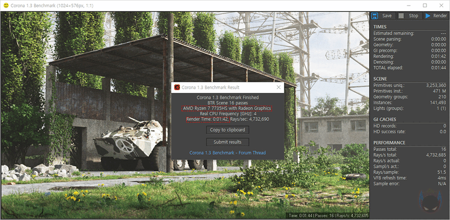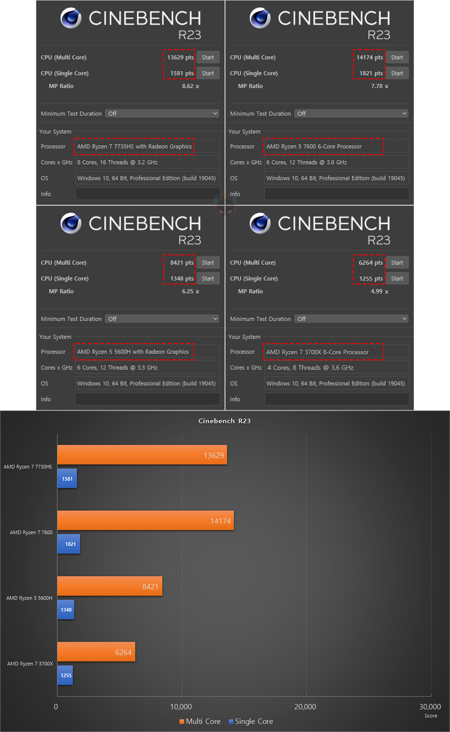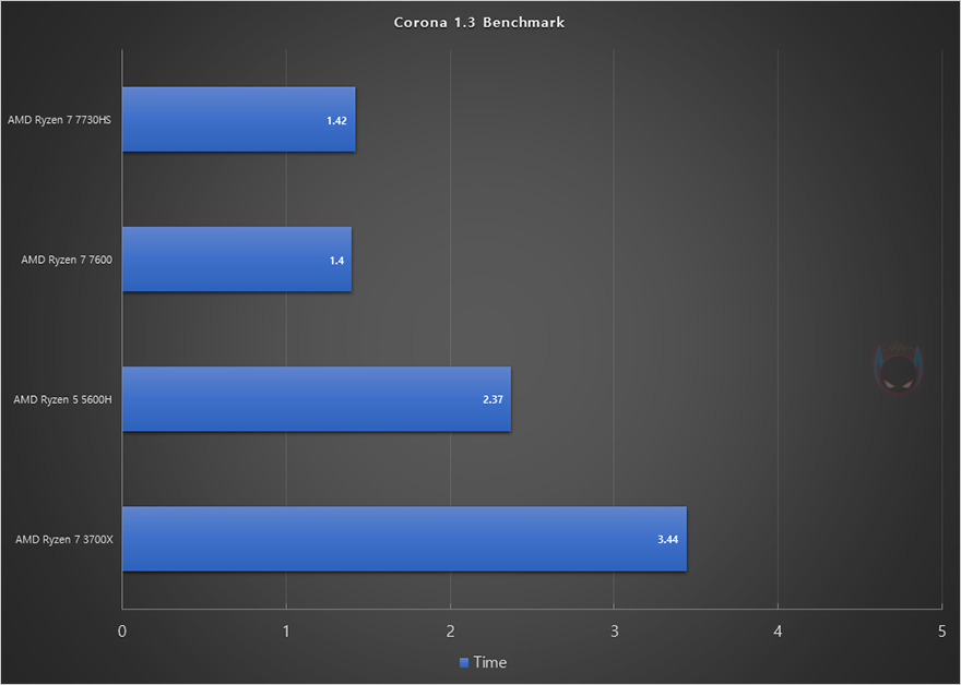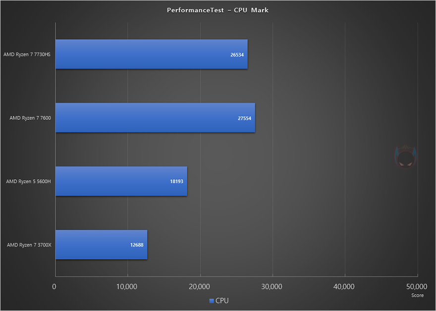 앞서 언급했듯이 UM773 Lite 미니 PC에는 AMD Ryzen 7 7735HS CPU가 탑재되어 있습니다. Ryzen 7 7735HS는 Zen4 기반의 가장 최신 APU CPU이기도 하죠. 코어(Core)는 8개, 스레드(Thread)는 16개 구성입니다. 그래서, 먼저 CPU의 성능을 확인해 보는데, AMD의 이전 세대와 현재 데스크톱 PC에 사용되는 7000 시리즈 CPU까지 함께 비교를 해 본 결과, Ryzen 7 7735HS의 성능 데스크탑 PC CPU은 Ryzen 5 7600과 비슷한 수준을 보여줍니다. CPU-Z Bench에선 오히려 앞서는 결과도 보여주죠. APU CPU지만, 데스크탑 PC CPU 부럽지 않게 고성능을 자랑합니다.