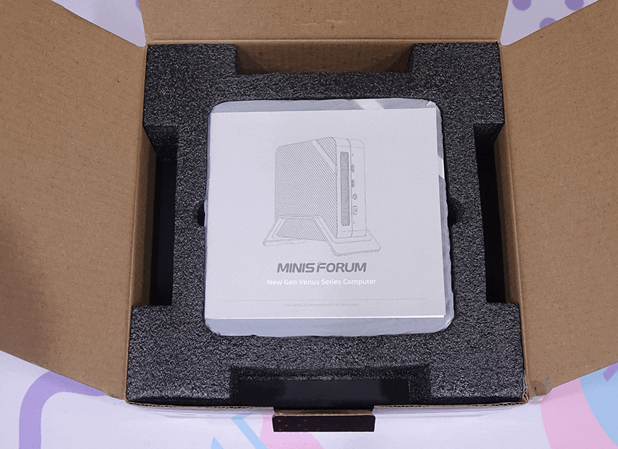 제품 박스를 열어보면, 외부 충격방지를 위해 스티로폼보다 충격완화가 더 좋은 우레탄-폼을 사용했으며, UM773 Lite 미니 PC는 비닐 포장되어 있습니다. 제품 구성은 제품 설명서(Manual), 비너스(Venus) UM773 Lite 미니 PC(mini PC), 주의 안내, 스탠드(Stand), 베사홀 브라켓(VESA bracket) 및 나사, 2.5인치 HDD/SSD 장착 나사, HDMI 케이블, 전용 S-ATA 케이블, 추가 여분 미끄럼방지 패드, 전원 어댑터 및 케이블로 이루어져 있습니다.