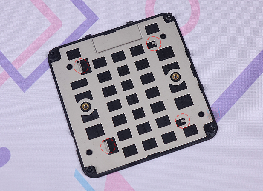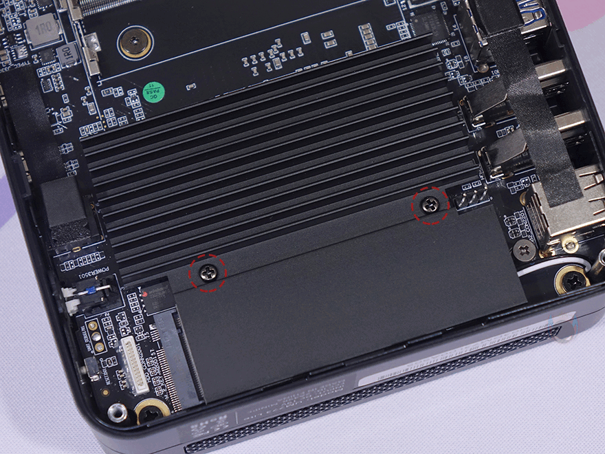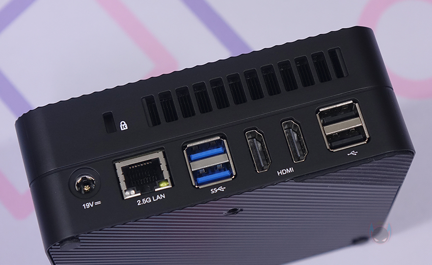 본체 후면에는 윗부분에 에어홀 처리와 함께 왼쪽에 켄싱턴 락(Kensington lock)이 적용되어 있으며, 아래에는 전원 어댑터 연결 포트를 비롯해 2.5Gb 랜(LAN), USB 3.2 Gen2 Type-A, HDMI 2개, USB 2.0 Type-A 포트가 배치되어 있습니다. 그리고, 본체 바닥부분 역시 상단과 동일하게 사선 방향으로 홈 처리를 해놨는데, 대각선 방향으로 각각 서로 다른 2쌍의 미끄럼방지 고무 패드가 부착되어 있습니다. 이 패드를 떼어내면, 고정 나사를 확인할 수 있는데, 나사를 모두 풀면 쉽게 바닥 커버를 분리할 수 있죠.