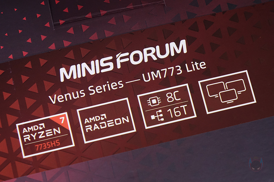 제품 패키지는 다른 미니 PC 제품들처럼 박스형태로 박스 전체가 밀봉처리가 되어있어서 소비자입장에선 판매 제품에 신뢰를 가질 수 있습니다. 그리고, 박스 상단에는 제품 옵션 표기를 확인할 수 있는데, 비너스(Venus) UM773 Lite 같은경우엔 No RAM, No Storage 옵션부터 구매가 가능하죠. 물론, 전원 플러그 규격도 한국과 호환되는 유럽형(EU)으로 선택할 수 있습니다. 또한, 박스 한쪽 측면과 후면에는 CPU에 대한 간략한 표기를 확인할 수 있는데, 시작에서 언급했듯이 UM773 Lite에는 AMD Ryzen 7 7735HS CPU가 탑재되어 있습니다. 8 코어(Core)/16 스레드(Thread) 구조에 내장그래픽은 라데온(Radeon) 680M이 탑재되었습니다. 뒤에서 확인하겠지만, UM773 Lite가 인기 있는 이유 중 하나는 바로 내장그래픽입니다.