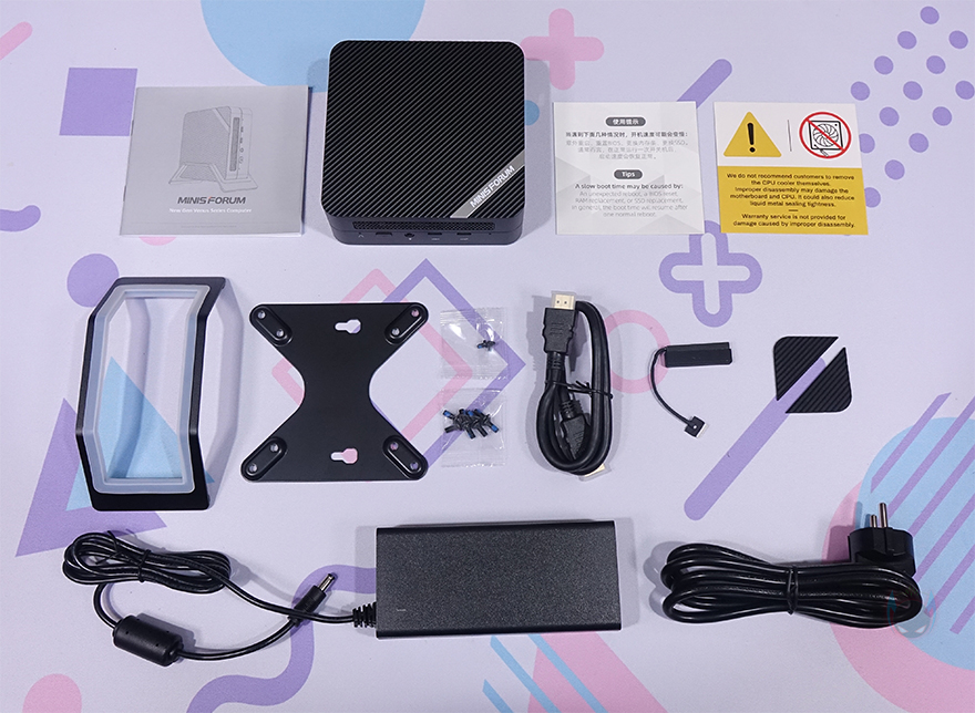 끝으로, UM773 Lite 미니 PC를 다른 미니 PC 제품들처럼 그냥 바닥에 놓고 사용해도 되지만, Minisforum은 세워서도 사용할 수 있게 전용 스탠드(Stand)를 제공해주고 있습니다. 스탠드 바닥에는 미끄럼방지 패드를 부착해 놨으며, 세워서 사용할 시 진동 소음을 줄이도록 실리콘 패킹도 적용되어 있죠. 그리고, 제공되는 전원어댑터의 최대 출력 전력은 약 120W이며, 제공되는 HDMI 케이블은 약 57.5cm 길이에 신호손실을 최소화하기 위해 금도금처리를 했으며, 사용하지 않을 시 부식방지를 위해 기본 덮개도 제공해주고 있습니다.