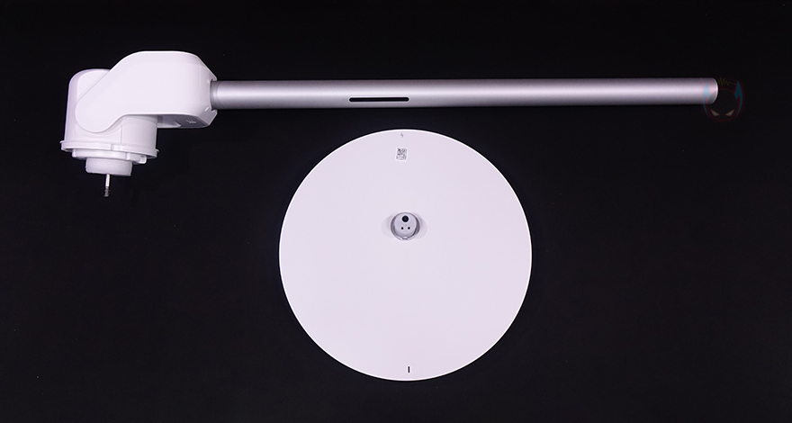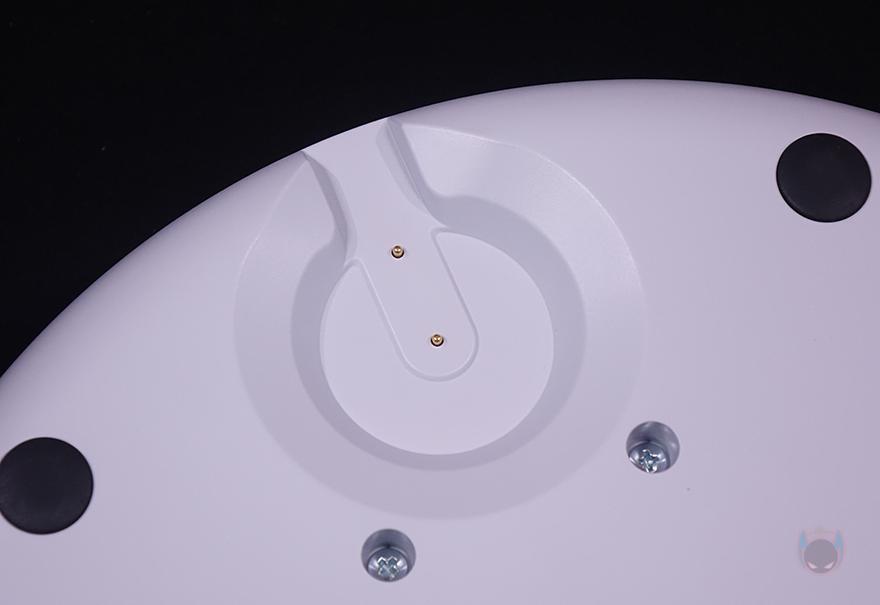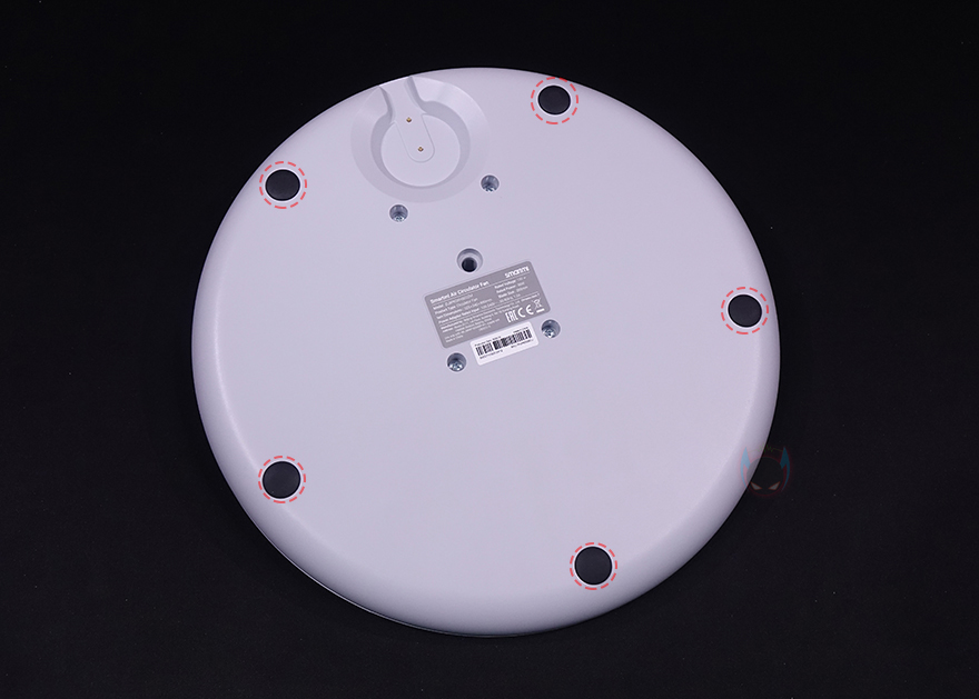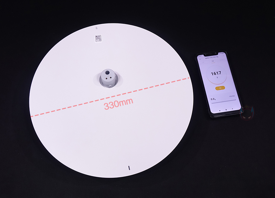 그래도, 개봉 시 팬, 받침대, 스탠드 조립은 기존의 Fan 시리즈(series) 제품들과 크게 다르지 않아서 큰 어려움이 없습니다. 일단, 받침대와 스탠드를 조립하는데, 그전에 받침대 같은 경우에는 기존 Fan 시리즈의 제품들 받침대와 동일한 330mm 크기를 가졌으며, 무게는 약 1.6kg입니다. 받침대 앞뒤로는 충전 상태를 확인할 수 있는 LED 인디케이터와 충전 연결부 표시를 해놨죠. 그리고, 충전 연결부 표시부근에는 애플 홈키트 어플 연동의 위한 QR코드도 표기해 놨습니다.