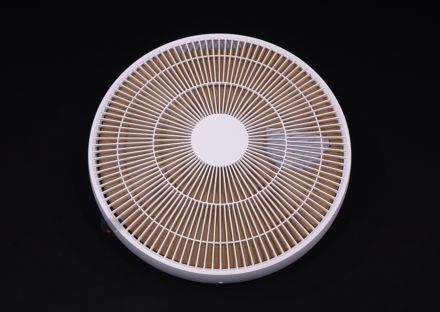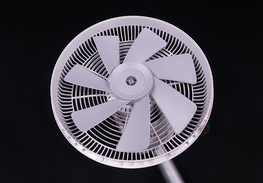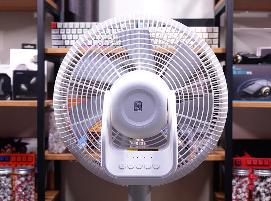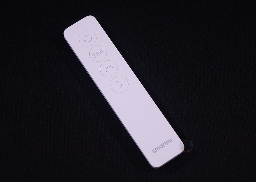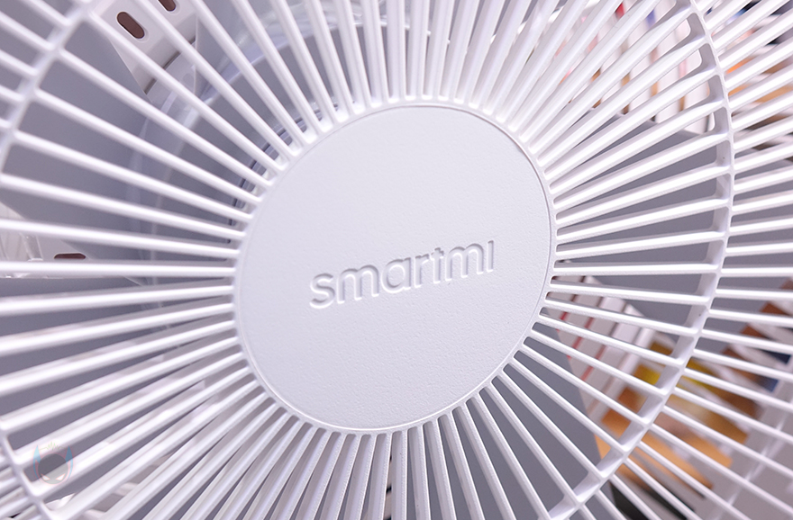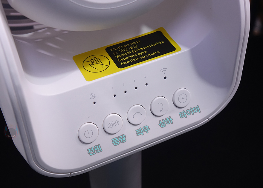 팬(Fan) 부분을 살펴보면, 전면 커버 가운데는 Smartmi 로고(logo)를 새겨놨으며, 홈은 손가락 굵기보다 작고 촘촘하게 해서 사고방지가 되도록 했습니다. 또한, 후면은 모터 부분으로 기존 Fan 시리즈와 달리 직관적으로 사용할 수 있는 버튼들이 다수 배치되어 있는데, 버튼마다 기능 표기를 해놔서 쉽게 이해할 수 있고, 바로 위에는 작동상태를 확인할 수 있는 LED 인디케이터도 적용되어 있죠.