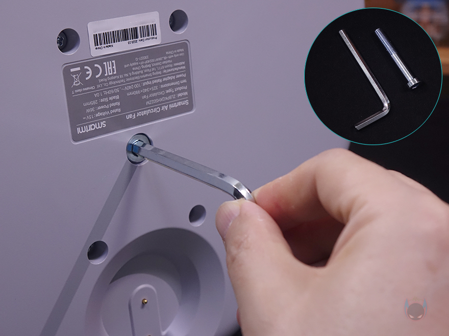물론, 받침대 밑바닥에는 미끄럼방지와 바닥 접지력을 위해 총 5개의 패드가 부착되어 있으며, 방금 언급했던 후면 충전기 연결부는 뒤에서 확인하겠지만, 자석(magnet) 방식으로 갖추고 있죠. 기존의 Fan 시리즈 무선 선풍기 제품들과 가장 큰 차이점 중 하나입니다. 그리고, 받침대와 스탠드 연결은 기존 제품들과 마찬가지로 접지 부분을 맞춰서 끼워주면 되고, 고정은 제공되는 나사와 렌치를 사용하면 됩니다.