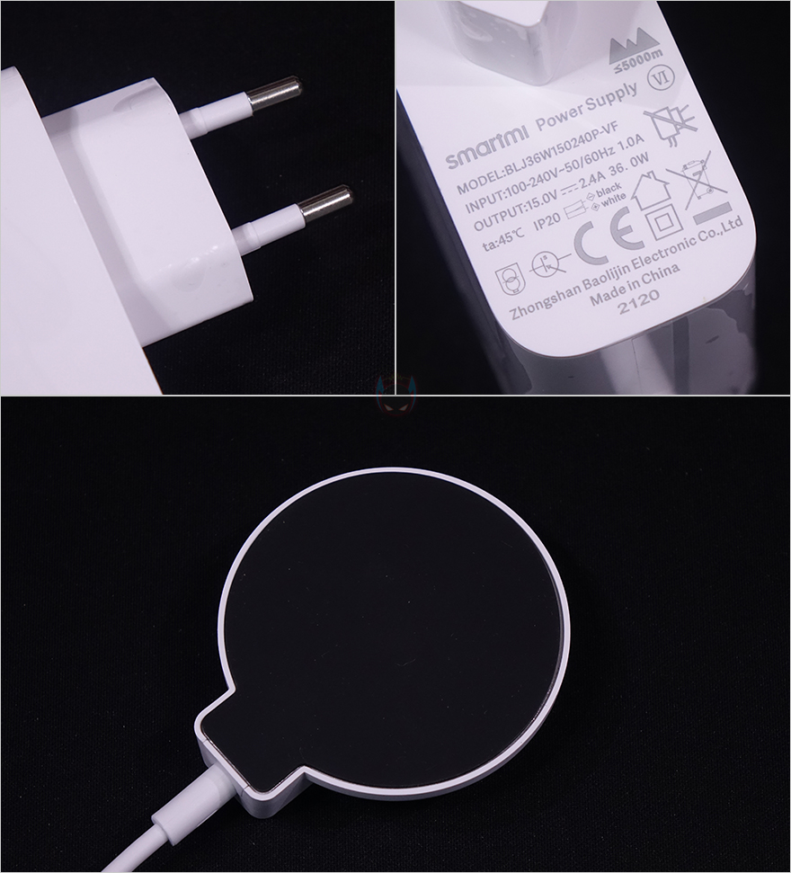 충전 어댑터 같은 경우에는 앞서 받침대 밑바닥에 확인했듯이 자석(magnet) 방식으로 쉽게 탈부착할 수 있게 갖추고 있는데, 일단 어댑터 플러그는 한국 규격에도 맞는 220V EU플러그이며, 소비전력은 최대 36W입니다. 그리고, 충전 접지 부분 밑바닥에는 미끄럼방지를 위해 패드를 부착해놨으며, 써큘레이터를 들고 접지부분 가까이 가면 자력에 의해서 저절로 부착되면서 충전이 작동됩니다. 기존에 삽입하는 방식보다 훨씬 편리하게 분리 장착할 수 있어서 좋습니다.