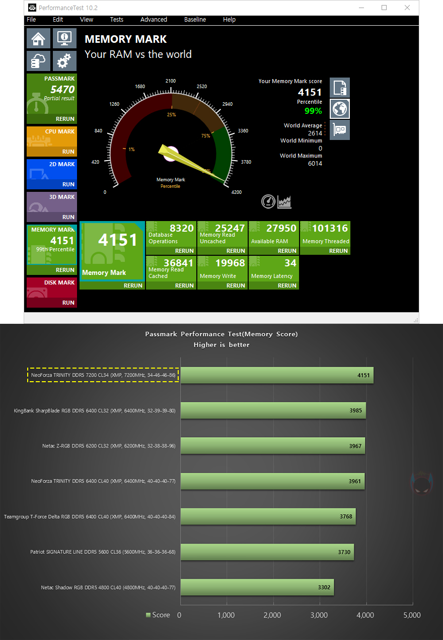 수동 오버클럭으로 7600MHz 클럭까지 적용된 TRINITY RGB DDR5 7200MHz 메모리를 다시 성능 확인해보면, XMP 프로파일로 적용되었던 7200MHz 클럭보다 좀 더 성능 향상된 것을 확인할 수 있습니다. AIDA64-Memory Benchmark에서 레이턴시나 대역폭이 더 빨라지고 많아졌으며, Passmark PerformanceTest와 UL Benchmark PCMark 10, Procyon 벤치마크 프로그램 모두에서도 더 높은 점수의 결과값을 보여줬습니다. 하이닉스 A다이 칩이 적용된 메모리라면 인텔 시스템기반에서 CPU나 메인보드가 받쳐줬을 때 최대한 오버클럭으로 사용하는 것이 가성비 효율이 가장 크다라는걸 그대로 보여주는거라 할 수 있죠.