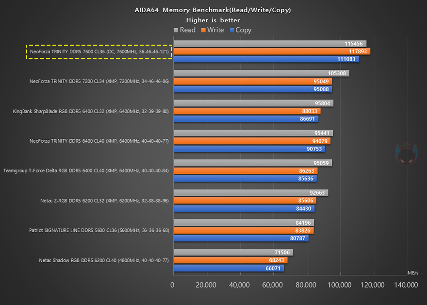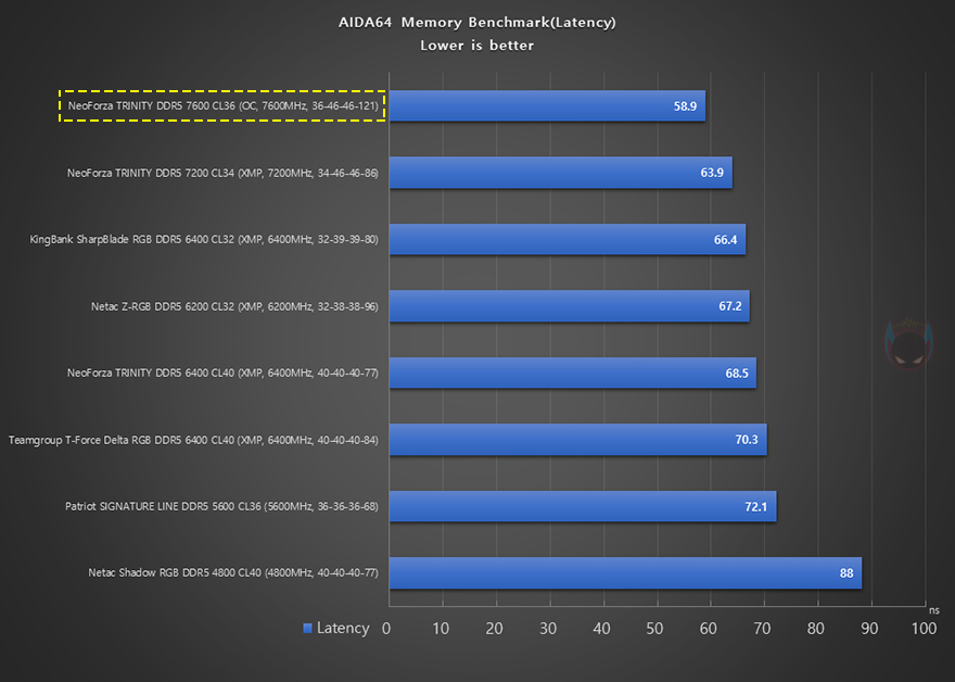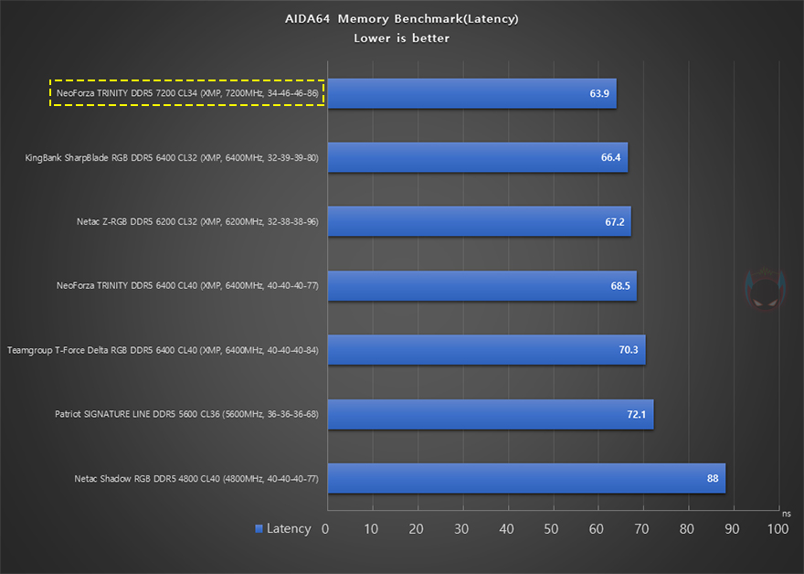 SK 하이닉스 A다이(Hynix A-Die) 칩을 적용하면서, 기존 제품에서 클럭이 더 확장된 Neo Forza(네오포르자)의 TRINITY RGB DDR5 7200MHz 메모리는 하이닉스 A다이 칩 적용에 따른 성능 향상을 그대로 잘 보여주는 제품입니다. 특히, 인텔과 AMD 시스템에 맞춰 사용할 수 있게 프로파일은 4개나 갖추고 있는 점은 소비자입장에서 매우 유용하죠. 또한, 하이닉스 A다이 칩 적용 메모리인만큼 인텔 PC기반에선 XMP 프로파일보다 더 높게 오버클럭 할 수 있어, 이미 높은 클럭을 자랑함에도 다시 한 번 성능을 끌어올릴 수 있어서 소비자입장에선 매우 만족스러운 DDR5 제품이라 할 수 있습니다. 물론, 기존의 RGB Sync 지원도 완벽하죠. 역시 기존 제품과 마찬가지로 아쉬운 점이라면 외형적으로 화이트 색상의 모델도 빨리 나오길 더 바래게 해주죠. 인텔 PC 기반에서 하이닉스 A다이 칩으로 적용된 높은 클럭의 DDR5 메모리를 원했다면, Neo Forza TRINITY RGB DDR5 7200MHz 메모리를 추천합니다.