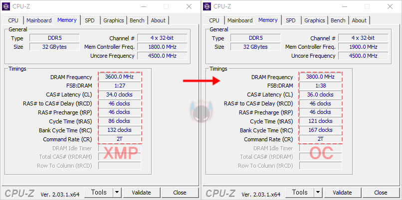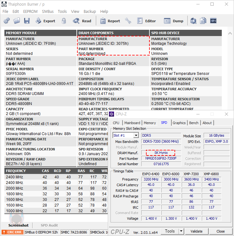 시작에서 언급했듯이 TRINITY RGB DDR5 7200MHz 메모리는 하이닉스 A다이(Hynix A-Die) 칩을 사용했습니다. 그래서, 현재 TRINITY RGB DDR5 메모리 최대 클럭 모델은 7800MHz까지 나왔으며, 8000MHz 클럭도 준비중이죠. 물론, 소비자가 메모리 모듈칩을 확인할 수 있는 방법은 Thaiphoon Burner 프로그램밖에 없는데, TRINITY RGB DDR5 7200MHz 메모리를 확인해보면, 하이닉스 A다이 확인이 안됩니다. 물론, CPU-Z를 통해 램 제조사가 SK 하이닉스(Hynix)인걸 확인할 수 있죠. 그래서, 하이닉스 A다이가 사용되었다면, TRINITY RGB DDR5 7200MHz 메모리는 이보다 더 높은 정확히는 1.4V기준으로 CPU나 메인보드가 고급형이라면 7600MHz까지 어렵지 않게 오버클럭할 수 있습니다. 그래서, 직접 수동 오버클럭을 해 본 결과, 7600MHz 클럭까지 쉽게 적용된 것을 확인했고, 램 타이밍도 상위 모델처럼 CL36으로 적용했습니다.