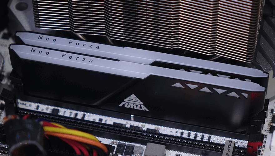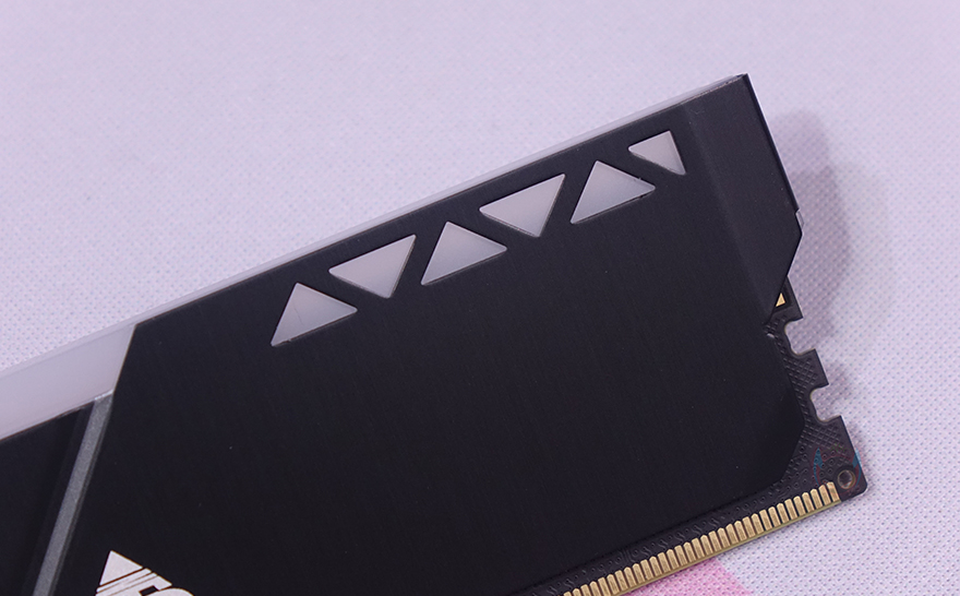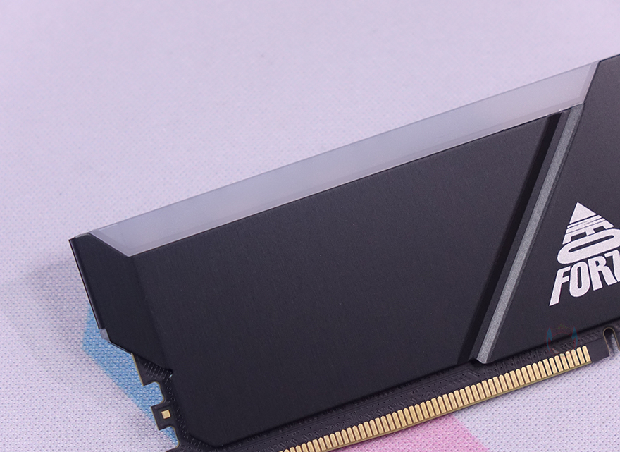 방열판 중간에는 로고(logo)를 새겨놨으며, RGB 효과를 볼 수 있는 상단 LED 바(bar)는 측면에서 봤을 때 반으로 나뉘어 한쪽은 그대로 노출된 디자인이고, 나머지 반은 방열판 일부가 덮힌 디자인입니다. 또한, 방열판 반대쪽 한쪽에는 역시 Neo Forza를 새겨놨으며, LED 바 상단에도 동일하게 표기를 하고 있죠.