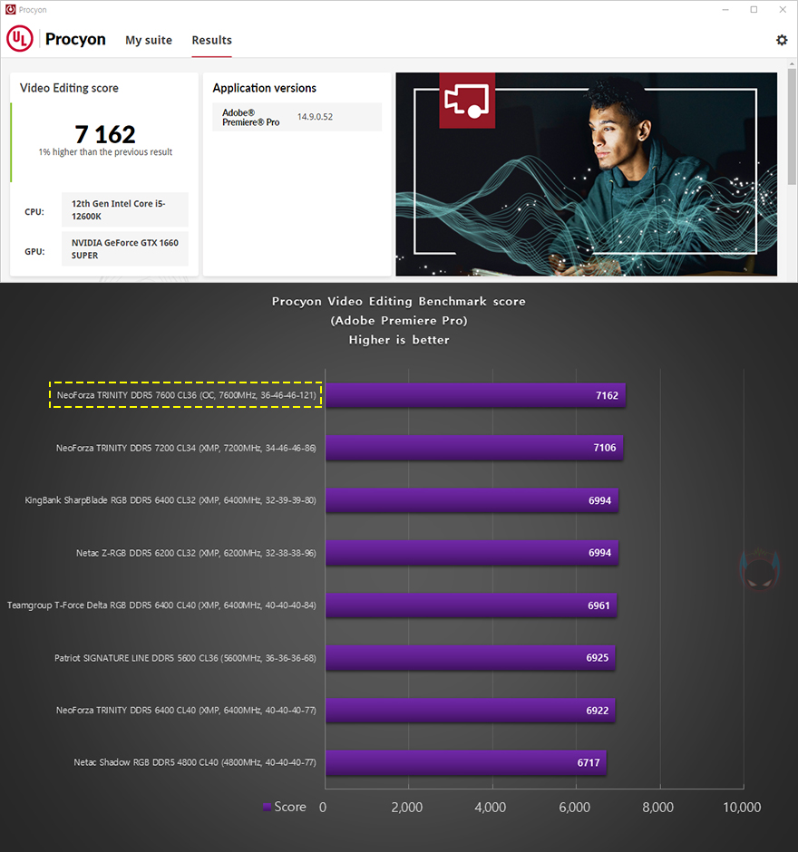 XMP 프로파일을 적용한 TRINITY RGB DDR5 7200MHz 메모리의 성능을 확인해보면, 비교 대상 전체 DDR5 메모리 중 가장 높은 XMP 프로파일 클럭으로 적용되었기 때문에, 전체 벤치마크 프로그램에서 가장 좋은 성능을 보여줍니다. 가장 기본적인 AIDA64-Memory Benchmark에서 읽기(Read)/쓰기(Write)/복사(Copy) 대역폭 모두 가장 큰 용량을 보여줬으며, 레이턴시 역시 가장 짧았습니다. 또한, 스코어 점수로 보여주는 Passmark PerformaceTest, UL Benchmark PCMark 10에서도 역시 높은 점수를 보여줬으며, 메모리 사용량이 많은 어도비(Adobe) 포토샵과 프리미어 프로(Premiere Pro) 편집작업으로 벤치마크 할 수 있는 Procyon에서도 가장 좋은 성능을 보여줬습니다.
