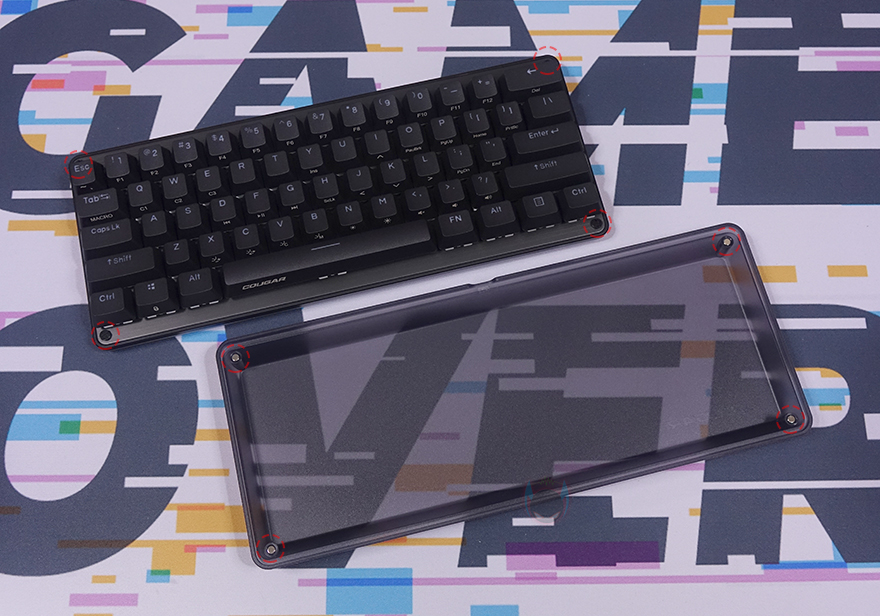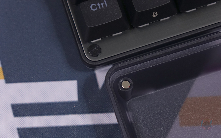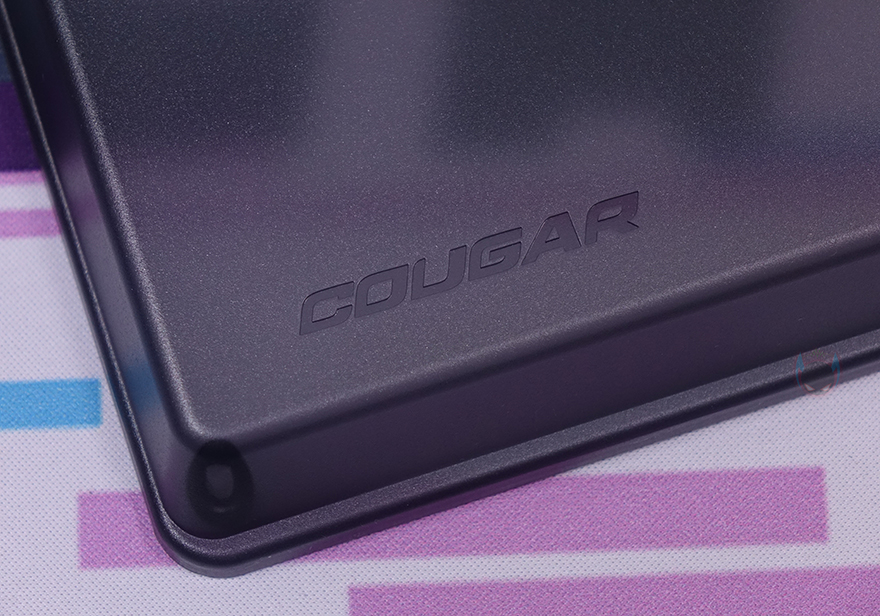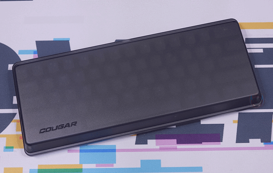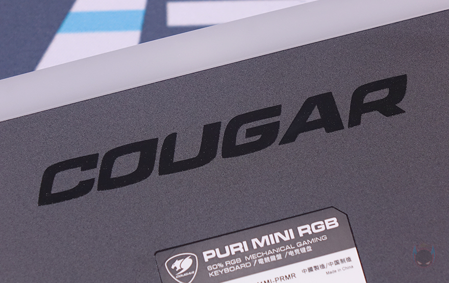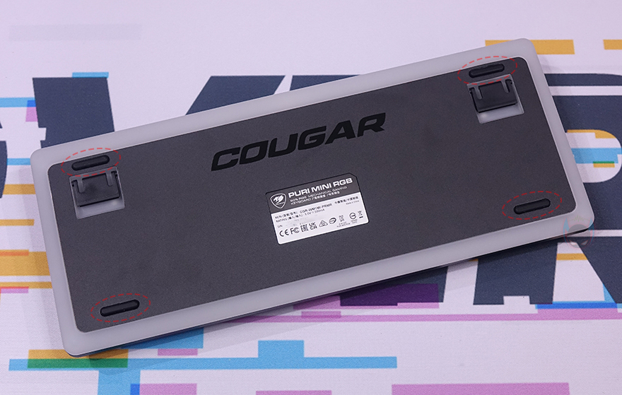 본격적으로 쿠거 PURI MINI RGB 키보드를 살펴보면, 미니 키보드 모델에서 역시 가장 먼저 눈에 들어오는 부분은 기본 제공되는 루프(roof) 덮개입니다. 쿠거는 2017년 첫 PURI 키보드 출시 때부터 당시 기성품 기계식 키보드 제품으로는 매우 드물게 플라스틱 소재로 자석방식의 전용 덮개를 제공했는데, 이제는 이 루프 덮개 기본 제공이 PURI 시리즈 키보드의 상징이 된 수준이죠. 그래서, PURI MINI RGB 키보드에서도 크기에 맞춘 자석 방식의 전용 루프 덮개를 제공해주고 있습니다. 덮개는 내부가 잘 보이지 않게 스모크 효과처럼 반투명으로 처리했으며, 안쪽에 4개의 자석이 적용되었고, 이는 키보드 모서리 부근에 적용된 나사와 접촉하면서 덮개 고정이 됩니다. 그리고, 덮개 한쪽에는 로고도 음각으로 새겨놨죠.