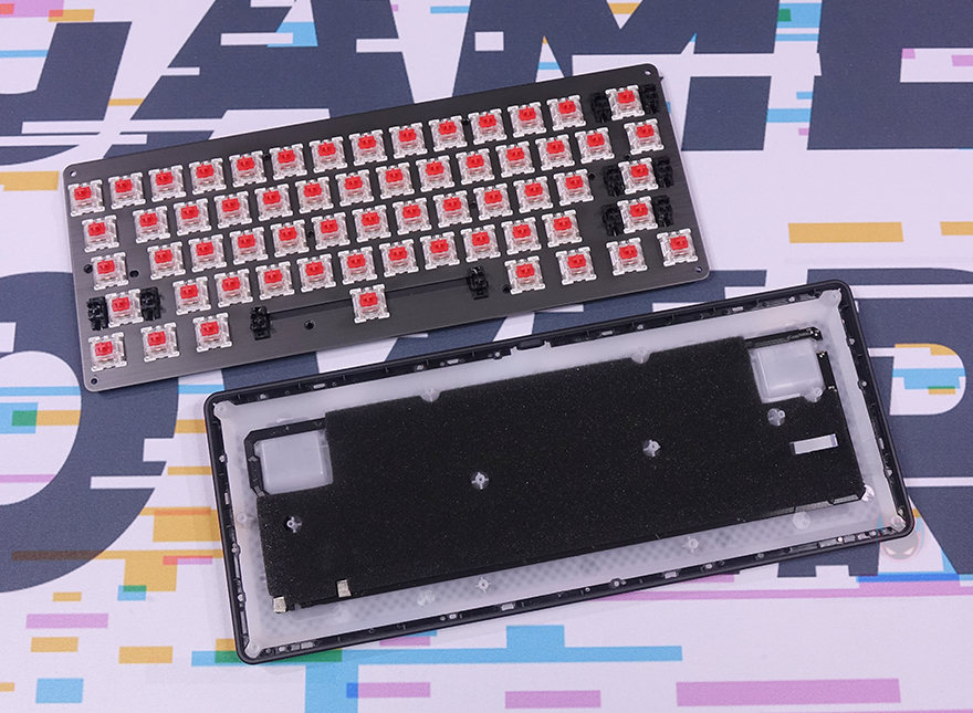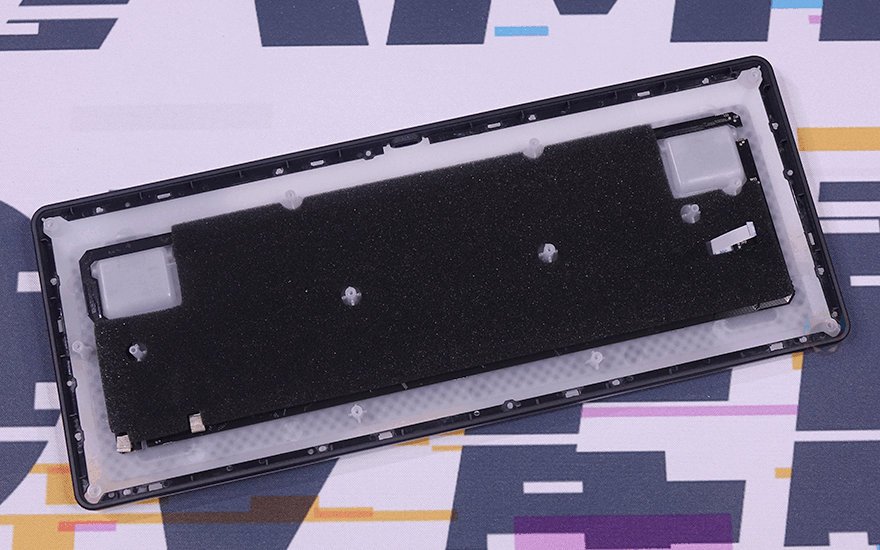 PURI MINI RGB 키보드는 보강판에 있는 나사들을 풀면, 상판과 하판 분리를 쉽게 할 수 있습니다. 분리해서 내부를 잠깐 살펴보면, 보강판과 PCB기판 사이에는 고무패킹으로 마감처리를 했는데, 따로 분리되지 않지만 사이간격이 있기 때문에 제품박스에서 확인했던 내부 구조 이미지 그대로 내부에 흡음재가 적용되었다는 것을 짐작할 수 있으며, 하판 내부에도 스펀지 재질의 흡음재를 사용했습니다. 그리고, 하판 흡음재를 걷어내면, 하판 RGB 조명효과를 위해 LED 장치가 적용된 것도 확인할 수 있죠.