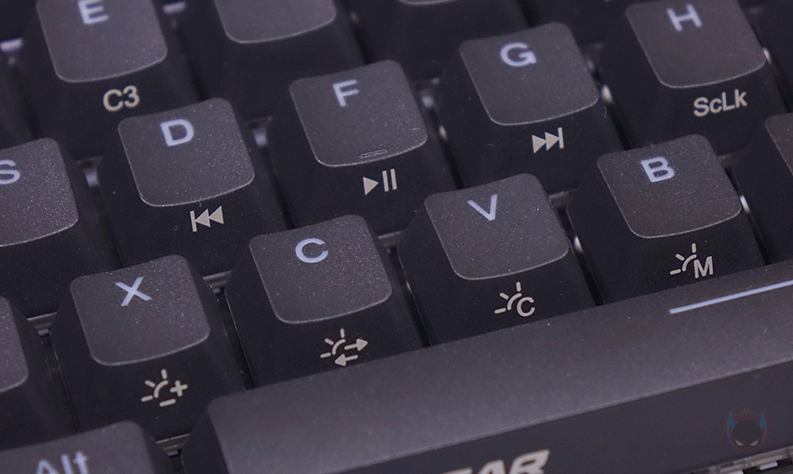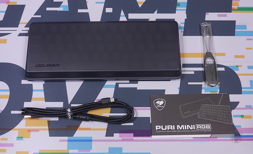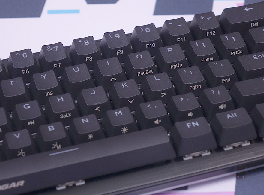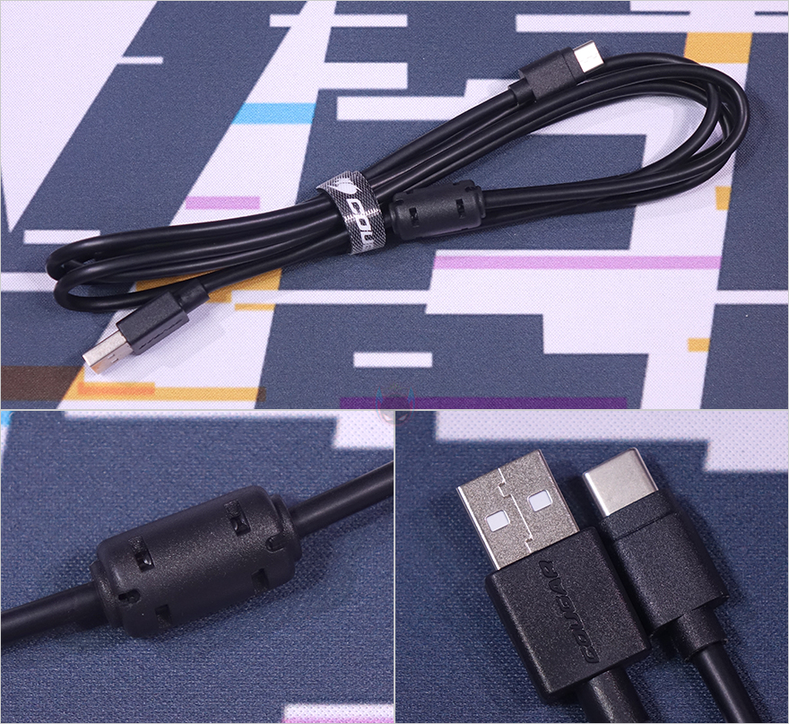 끝으로, 쿠거 PURI MINI RGB 키보드 역시 Fn키 조합으로 부가 기능들을 지원하고 있는데, 그전에 미니 키보드이기 때문에 풀-배열 키보드에서 볼 수 있었던 F숫자키나 방향키, 특수키들도 역시 Fn 조합으로 사용됩니다. 그리고, 앞서 키캡에서 언급했듯이 Fn키로 사용되는 기능들은 모두 키캡 측면에 표기되어 있기 때문에 쉽게 구분이 가능하며, 부가기능에는 Fn키 바로 위에 </>/? 키가 볼륨조절 및 음소거, N/M키는 RGB 백라이트 밝기조절 기능으로 배치되어 있으며, 그 옆으로 B키는 RGB 백라이트 모드 전환, V키는 RGB 백라이트 단색변경, C키는 모드 방향전환, X키는 모드 속도조절 기능이 되겠습니다. 그리고, 그 위로 D/F/G키는 재생컨트롤, Tab키는 매크로모드, Q/W/E키는 프로파일 기능으로 지원하고 있죠. 물론, ESC키와 윈도우키도 각각 설정초기화와 윈도우키 잠금/해제 기능을 가지고 있습니다. 마지막으로 분리형 USB 전원케이블은 총 1.8m 길이에 신호손실 최소화를 위해 노이즈필터가 적용되어 있으며, 연결 인터페이스는 USB Type-C to A로 갖추고 있습니다.