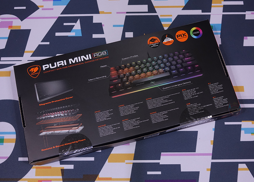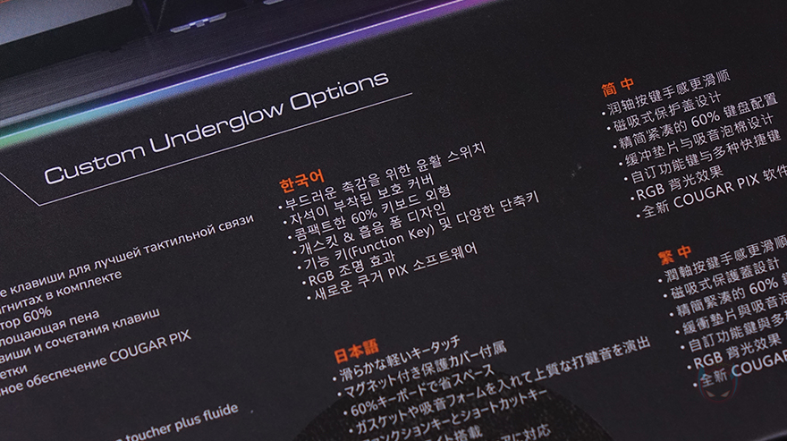 그리고, 박스 후면에는 키보드 풀-샷 이미지와 함께 키보드 내부 구조 이미지도 담고 있는데, 가장 최근 제품답게 요즘 기계식 키보드의 트렌드인 가스켓(Gasket) 하우징과 이중 흡음재가 적용된 것을 확인할 수 있죠. 그리고, 풀-샷 이미지에선 초기화, 매크로 등 부가 기능 일부를 표시해 놨으며, 아래에는 한국어를 포함해 각 나라별 언어로 지금까지 언급했던 주요 특징들을 표기해 놨습니다.