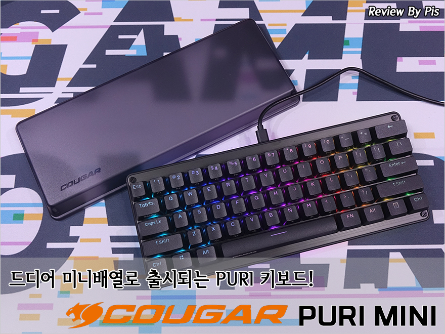 국내 PC시장에서도 종합 하드웨어 브랜드로 꽤나 인지도를 쌓아 자리를 잘 잡은 쿠거(COUGAR)는 PC케이스로 시작해 현재는 다양한 제품군을 갖추고 있습니다. 특히, 게이밍이라는 콘셉트는 쿠거 초창기시절부터 적용해서 현재까지 잘 유지해오고 있죠. 주변기기 역시 쿠거의 대표 라인업 중 하나인데, 2017년에 첫 기계식 키보드 라인업으로 PURI(퓨리) 키보드를 선보이면서 현재까지도 쿠거의 대표 기계식 키보드 라인업으로 유지되고 있습니다. 또한, 당시에 풀-배열과 텐키리스 모델을 이미 출시했고, 시대 유행에 맞춰 RGB 버전까지 출시했죠. 그리고, 최근에는 드디어 60% 배열의 미니 키보드 모델까지 출시를 했습니다. 바로, PURI MINI 키보드죠. PURI MINI 키보드 역시 스위치 RGB LED 적용 유무에 따라 2가지로 나뉘어서 나왔는데, 오늘은 이중 RGB가 적용된 PURI MINI RGB 키보드를 한 번 만나보도록 하겠습니다.
