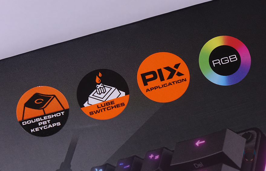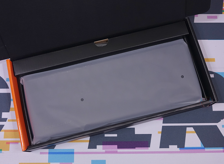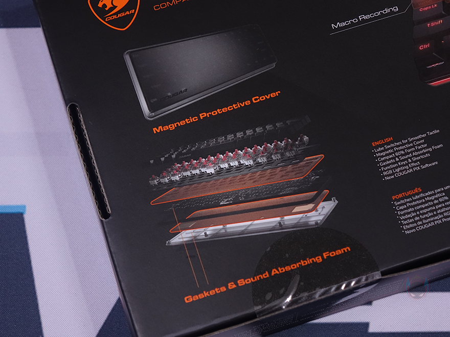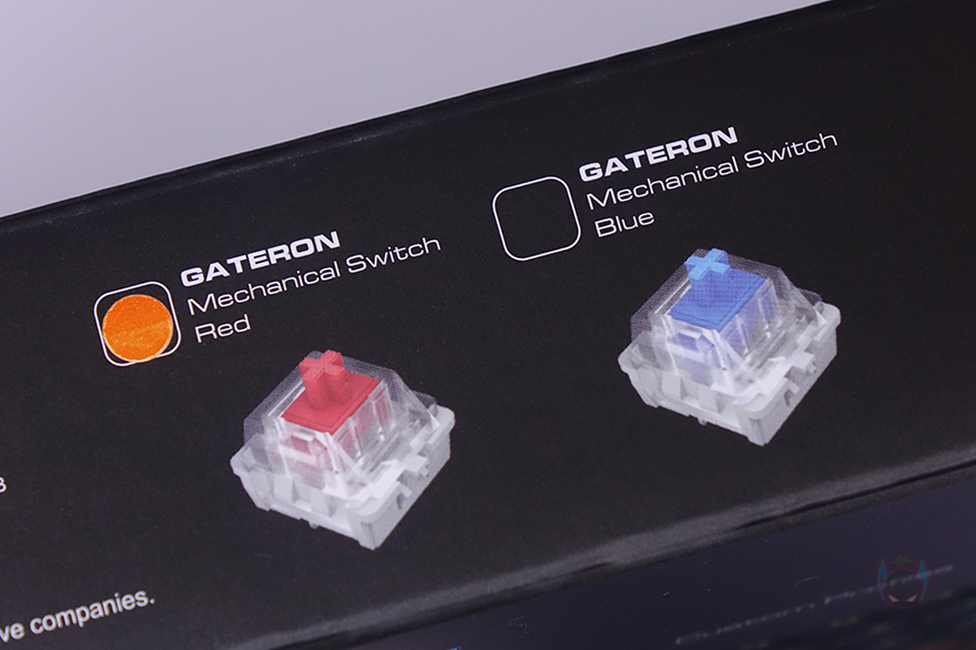 제품박스부터 살펴보면, 전면에는 모델명과 함께 제품 이미지 그리고 주요 특징으로 이중사출 PBT 키캡, 윤활처리된 스위치, PIX 소프트웨어 지원, RGB 조명효과를 표기해놨습니다. 그리고, 박스 측면에는 각각 제품의 기본 사양과 스위치 구분 표기를 확인할 수 있는데, 그동안 쿠거는 자사 기계식 키보드에 체리와 자사 커스텀 스위치 2가지를 주로 사용해 봤는데, 이번에 처음으로 게이트론 스위치를 사용했습니다. 참고로, 현재 판매 중인 스위치는 적축만 있습니다.