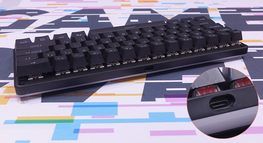 키보드 무게는 루프 덮개를 사용했을 때, 약 683g이며, 키보드만 측정해 보면 약 564g으로 미니 키보드지만 앞서 제품박스에서 내부 구조 이미지를 확인했듯이 흡음재가 내부에 적용되었기 때문에 제법 무게감이 있습니다. 키보드 배열은 60%으로 총 61 키를 가졌고, 키 스타일은 키캡 아래가 노출된 비키-스타일이며, 스타일에 따라 스위치 바로 아래 보강판이 상판 역할도 동시에 하는데 메탈 재질입니다. 그리고, 키보드 전면 중앙에는 분리형 USB 전원케이블과 연결되는 USB C타입 포트가 배치되어 있죠.