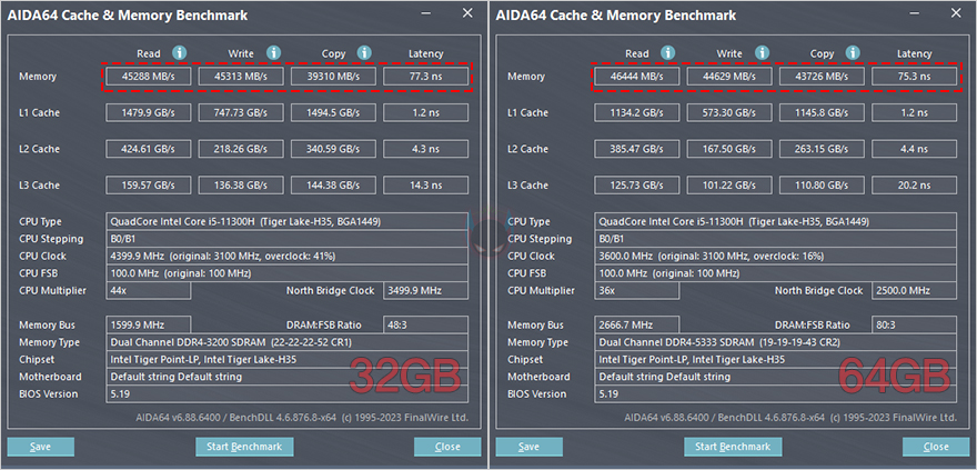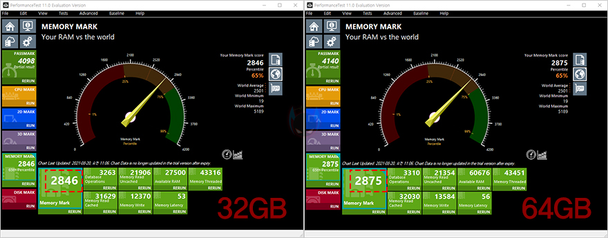 먼저 노트북에서 비교를 해봤는데, 인텔 CPU기반의 노트북 경우 클럭 비율과 용량에 따라 성능 차이가 확연한 부분이 있고, 크지 않은 부분도 있다. 가장 기본적인 AIDA64-Memory Benchmark에선 동일한 클럭과 램 타이밍을 가지고 있어서 레이턴시 차이가 크지 않지만, 용량의 차이가 있어서 읽기/쓰기/복사에 대한 대역폭 차이가 분명 있는데, 특히 복사 대역폭 용량이 KingBank SODIMM DDR4 64GB용량답게 더 많은 것을 확인할 수 있습니다. 그리고, Passmark PerformanceTest에 메모리 벤치마크에서도 역시 32GB와 64GB 용량 차이로 성능 차이가 있는 모습을 보여줬고, PCMark10과 Procyon 포토샵 사진 편집 벤치마크에서도 역시 KingBank SODIMM DDR4 3200MHz 32GBx2(64GB)가 좀 더 나은 모습을 보여줬습니다.