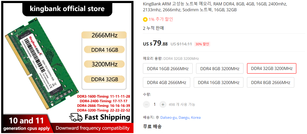 데스크탑PC DIMM 메모리와 달리 노트북과 미니 PC에 사용되는 SODIMM 메모리는 오버클럭 같은 지원이 없기 때문에, 클럭비중의 성능보다는 용량비중의 성능이 좀 더 중요합니다. 특히, SODIMM DDR4 메모리 같은 경우 이미 3200MHz 클럭이 최고치이고 32GB 용량이 최고치라는 점에서 KingBank SODIMM DDR4 메모리를 듀얼채널로 64GB 사용했을 시 노트북이나 미니PC에서 가장 좋은 성능을 보여줄 수 있습니다. 경쟁사들에 비해 가격도 비교적 저렴하지만, 유명 메모리 모듈을 사용하기 때문에 동급 제품들과 성능 차이가 없다면 좀 더 저렴한 KingBank SODIMM DDR4 메모리를 선택할 수 밖에 없죠. 노트북이나 미니 PC에 사용할 SODIMM DDR4 메모리로 최대 클럭과 최고 용량을 좀 더 저렴하게 가성비로 구입하고 싶다면, KingBank SODIMM DDR4 3200MHz 32GB 모델을 추천합니다.