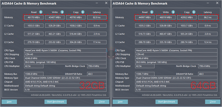 이번엔 미니PC(mini PC)에서 사용을 해봤는데, AMD CPU 기반의 미니 PC에선 노트북보다 좀 더 고사양이기 때문에 동영상 편집 같은 작업도 할 수 있죠. 일반적으로 메모리 클럭이 동일하고 용량에서 차이가 난다면 동영상 편집에선 무조건 성능 차이를 보입니다. 일단, 기본적으로 AIDA64-Memory Benchmark에선 KingBank SODIMM DDR4 64GB 메모리의 레이턴시가 32GB보다 좀 느리지만, 역시 대역폭에서 확실히 많은 용량을 보여주고, Passmark PerformanceTest 메모리 벤치마크와 전체 시스템 벤치마크인 PCMark 10에서도 역시 메모리 용량차이로 KingBank SODIMM DDR4 64GB가 좀 더 좋은 결과를 보여줬습니다. 그리고, 마지막으로 Procyon에선 어도비 프리미어 프로(Adobe Premiere Pro) 동영상 편집 벤치마크로 비교했을 때, 확실히 32GB 용량보다 64GB 용량이 높은 점수를 보여줬습니다.