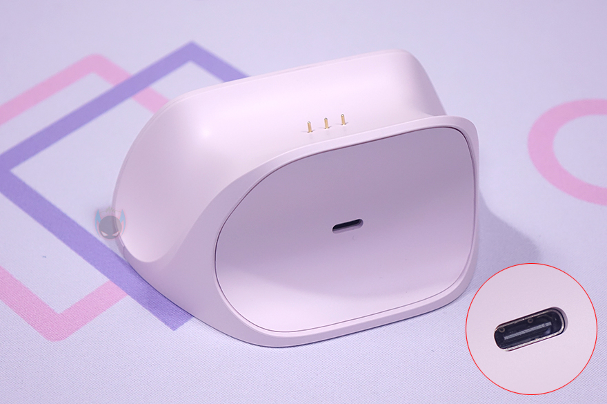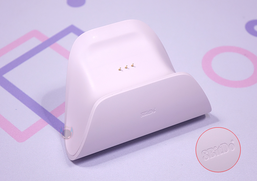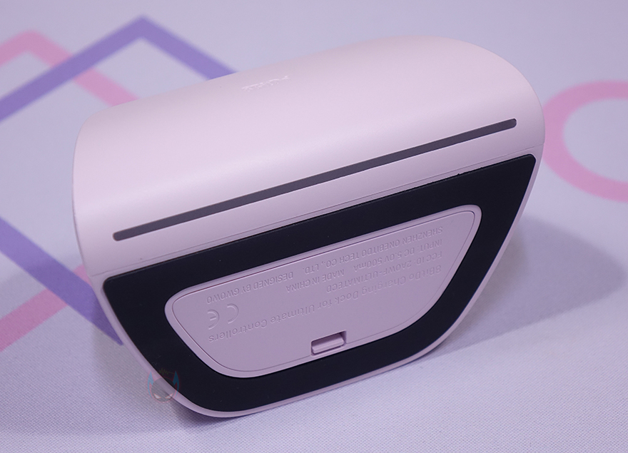 앞서 제품박스에서 잠깐 언급했듯이 충전독(charging-dock) 역시 컨트롤러 색상에 맞춰서 적용하고 있으며, XBOX 컨트롤러처럼 거치대에 얼티메이트 2.4G 무선 컨트롤러를 올려놓기만 하면 됩니다. 측면에서 보면 약간 뒤로 기울어진 형태로 거치되며, 충전독만 따로 좀 더 살펴보면, 전면에 음각으로 로고(logo)를 새겨놨으며, 후면에는 USB충전케이블과 연결되는 USB Type-C 포트가 배치되어 있죠. 또한, 충전독 전면에서 아래로 내려가면 충전상태를 확인할 수 있는 LED 램프를 바(bar) 형태로 길게 적용해 놨습니다.