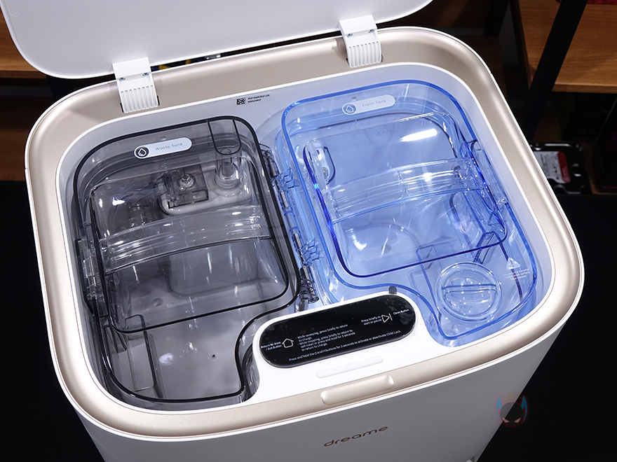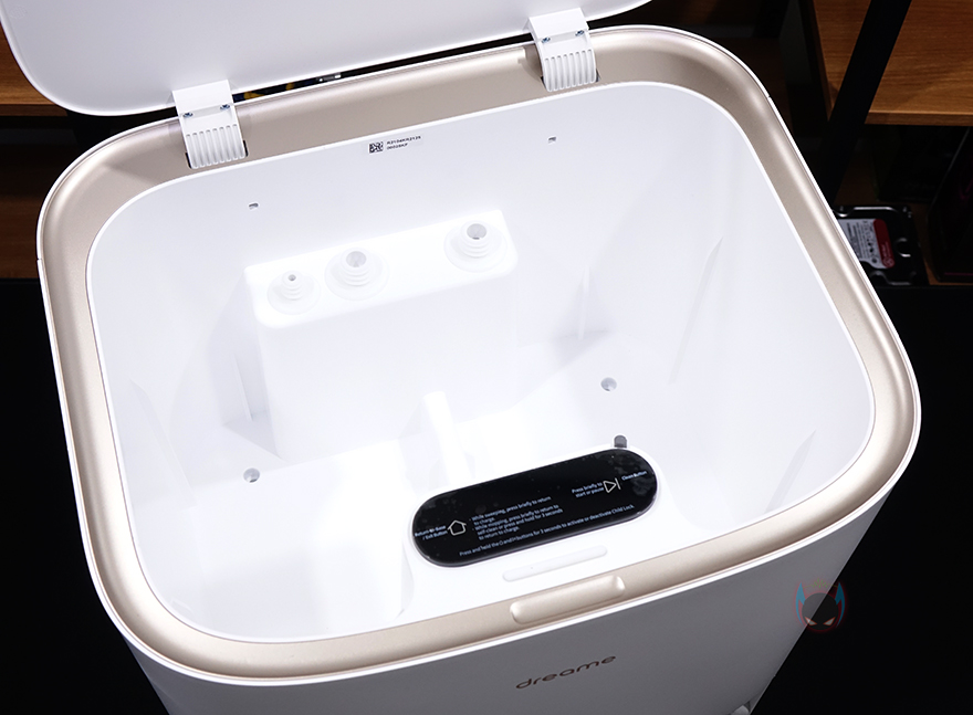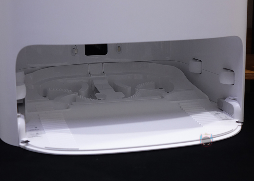 그리고, 베이스 스테이션 상단 커버를 열어보면 2개의 물통이 있는데, 왼쪽 검은색 통은 오수통, 오른쪽 파란색 통은 세척정수통으로 오수통 용량은 4L, 세척 정수통 용량은 4.5L입니다. 대용량이라 세척 정수통은 일주일이 한 번 정도 보충해 주면 되고, 그냥 물로 세척하는 것보다 좀 더 깨끗하게 걸레 세척을 하고 싶다면 별도로 판매되는 전용 세제를 함께 사용하면 됩니다. 두 물통 모두 물이 새지 않도록 고무 패킹처리도 되어 있죠. 베이스 스테이션 후면에는 특별한 것 없이 전원케이블이 연결되는 부분을 좀 더 가릴 수 있게 안쪽으로 디자인 처리 해놨습니다.