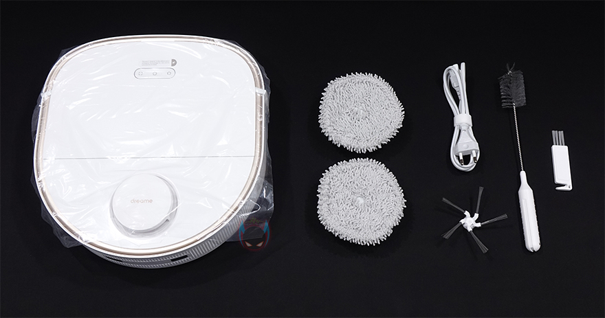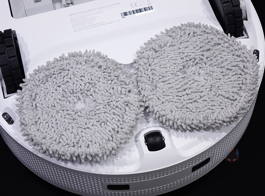바닥 후면에는 물걸레 패드가 장착되는 자리로 물걸레 패드는 2개가 1쌍인 원형 패드로 자석방식으로 쉽게 탈부착할 수 있습니다. 참고로, 앞부분의 진공 흡입력은 4000Pa이며, 물걸레 패드는 1kg 압력으로 누르면서 회전식으로 닦습니다. 그리고, 로봇청소기의 내장배터리 용량은 6400mAh입니다.