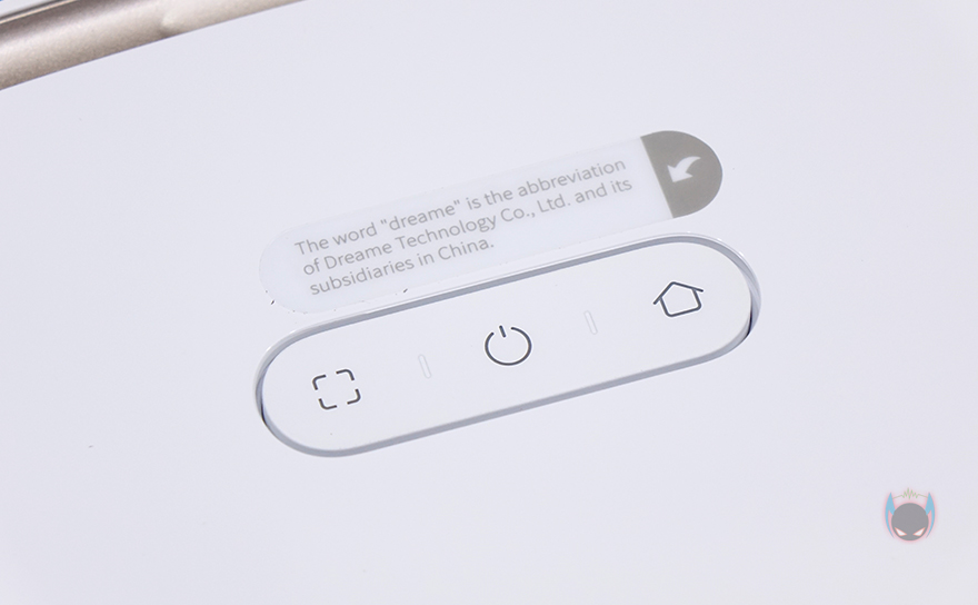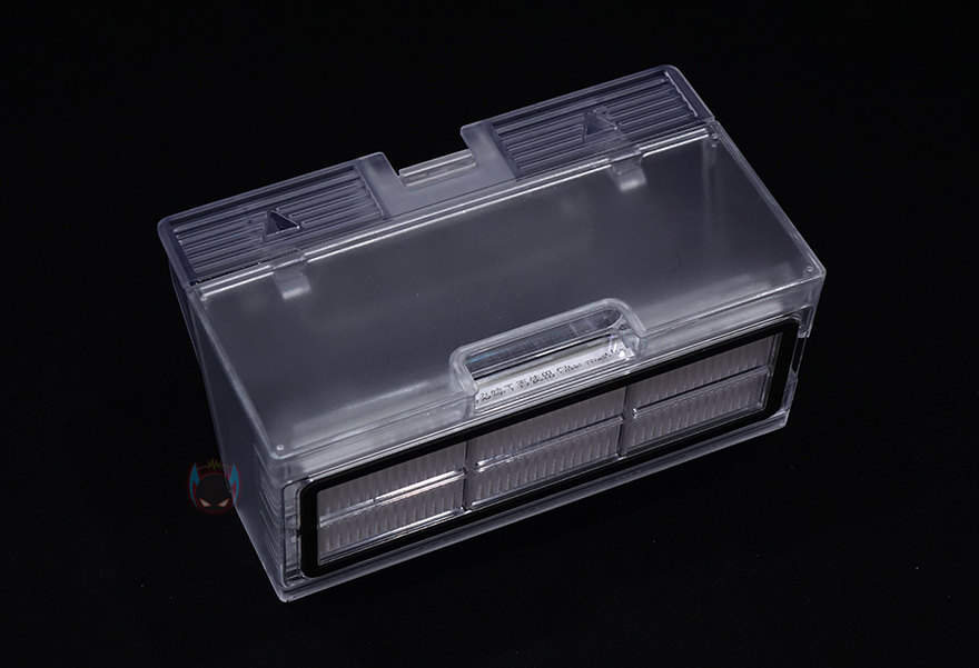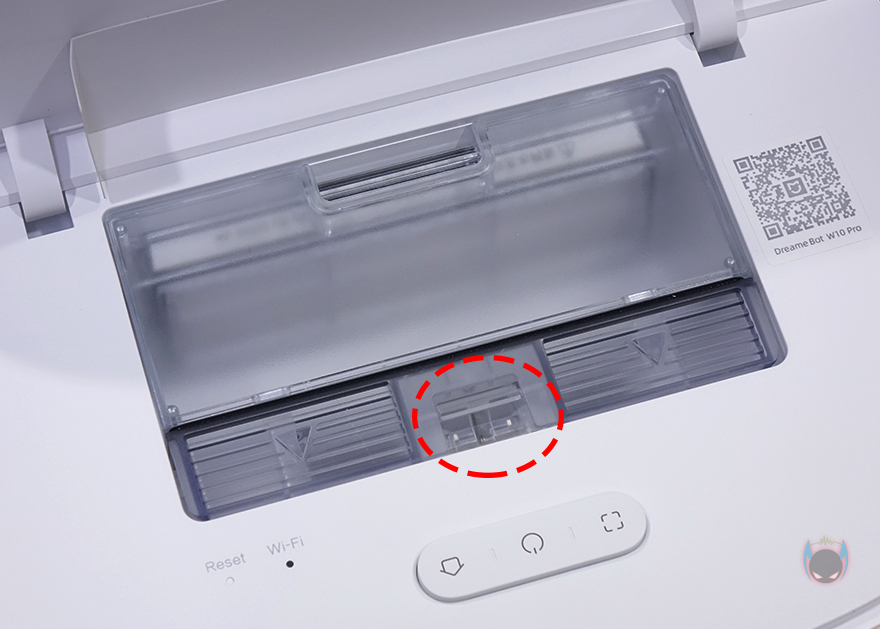 로봇청소기 상단에는 앞부분에 터치 버튼 배치와 함께 먼지통이 내부에 수납되어 있는데, 상단 커버를 올리면 쉽게 열리면서 확인할 수 있습니다. 또한, 커버를 열면 먼지통 앞부분에 초기화 버튼과 WiFi 연결상태를 확인할 수 있는 LED 인디케이터도 배치된 것을 확인할 수 있죠. 먼지통은 앞쪽 걸쇠장치를 누르면 쉽게 분리가 되고, 먼지통 용량은 450ml입니다. 당연히 먼지통에는 필터도 적용되어 있죠. 그리고, 앞부분에 배치된 터치 버튼은 가운데 전원 버튼, 집모양의 버튼은 베이스 스테이션으로 복귀하는 기능, 나머지 버튼 하나는 구역청소를 해주는 기능입니다.