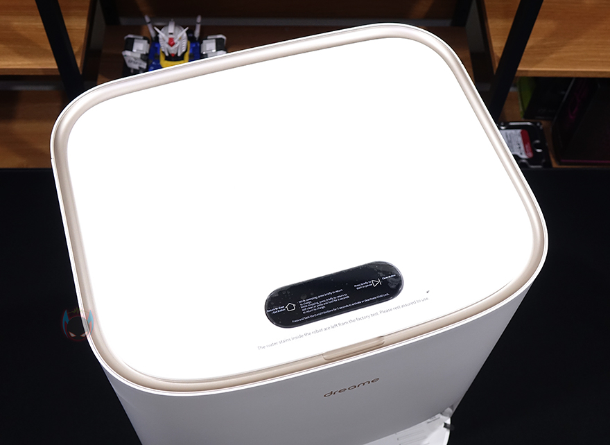 본격적으로 드리미(Dreame) W10 Pro 로봇청소기를 살펴보면, 로봇청소기 형태는 가장 흔히 볼 수 있는 전체 원형 디자인이 아닌 한쪽만 원형을 가지고 있습니다. 그러니깐 전면은 라운딩 사각 디자인이고, 후면이 반원 같은 디자인을 가지고 있죠. 전면을 라운딩 사각으로 적용한 이유는 원형 로봇청소기의 단점인 모서리 구역 청소를 제대로 할 수 없는 한계 부분을 개선하기 위해 적용된 겁니다. 여기에 전체적으로 화이트 색상에다가 포인트로 상단 테두리에 골드색상 라인을 적용하고 있습니다. 그리고, 전면에는 앞서 제품 박스에 주요 특징으로 표기했던 장애물 감지와 카펫 감지를 위해 AI 비주얼 센서(오른쪽)와 3D ToF 센서(왼쪽)가 탑재되어 있는데, 자동으로 감지하는 카메라 기능인만큼 한 번씩 청소를 해주는 게 기능 유지에도 좋습니다. 그리고, 왼쪽 측면에는 모서리를 감지할 수 있는 엣지 센서가 적용되어 있죠.