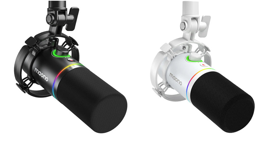 MAONO(마오노) PD200X 마이크를 살펴보면, 일단 색상은 블랙(Black)과 화이트(White) 2가지 색상으로 출시되었습니다. 그리고, 마이크에는 기본적으로 쇼크 마운트가 장착된 상태이죠. 쇼크 마운트까지 장착된 상태의 마이크 총 무게는 약 308g으로 USB/XLR 듀얼 모드 마이크 치고는 가벼운 편입니다. 그리고, 마이크의 캡슐(Capsule) 부분은 기본적으로 윈드 스크린(Wind Foam)이 장착된 상태인데, 끼우는 방식이라 쉽게 분리가 가능하고, 분리하면 내부 다이내믹 마이크 캡슐(Dynamic Mic Capsule)을 쉽게 확인할 수 있습니다. 그리고, 캡슐과 바디 경계 부분에는 RGB 조명효과를 볼 수 있게 디자인 처리 되어 있습니다.
