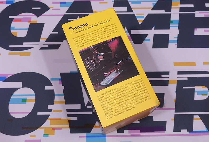 제품박스부터 살펴보면, 전면에는 모델명과 함께 제품 이미지를 확인할 수 있는데 마이크 이미지만 있는게 아니라 쇼크 마운트(Shock Mount)까지 함께 장착된 이미지를 볼 수 있습니다. 쉽게 말해, 마이크 붐 암(Boom Arm)에 사용할 수 있게 나온 제품이라는 거죠. 또한, 이미지 아래에는 마오노 어플인 마오노 링크(Maono Link)와 RGB 조명효과 적용 표기도 확인할 수 있습니다. 그리고, 박스 한쪽 측면에는 자사의 다른 마이크 제품들과 마찬가지로 해당 제품의 소개 문구를 담고 있으며, 반대쪽 측면에는 제품의 주요 특징으로 쇼크 마운트, USB-C/XLR 겸용 연결, 2-in-1 디지털 노브, RGB, 음소거 버튼을 표기해 놨습니다.