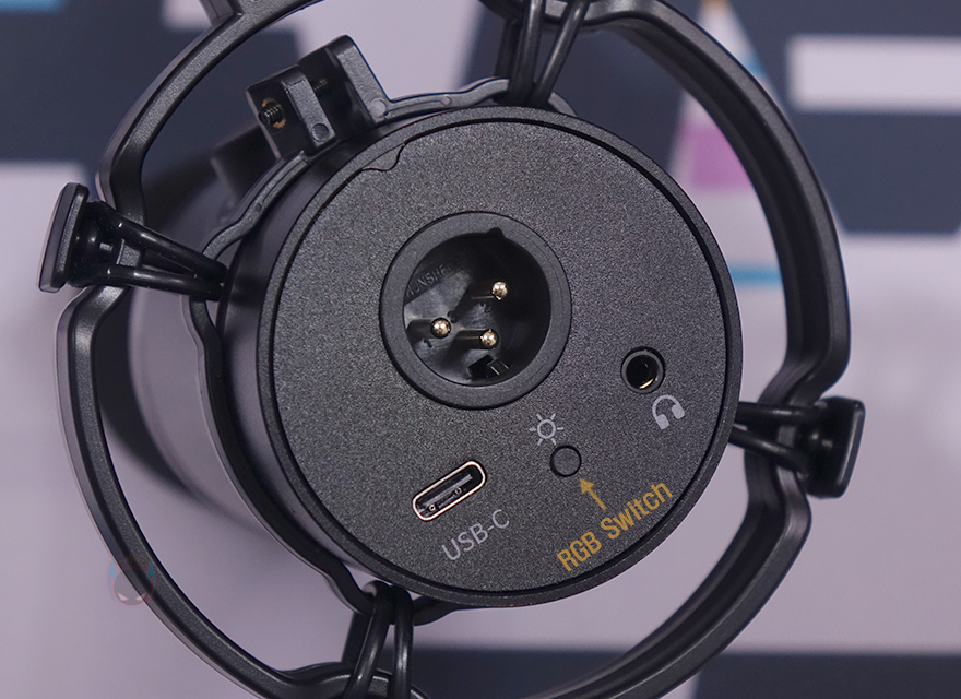 마이크 캡슐 아래 바디(Body) 부분은 메탈(Metal) 재질이며, 마이크 게인(Mic Gain)과 헤드폰 볼륨(Headphone Volume) 조절을 할 수 있는 2 in1 디지털 노브(Digital Knob)가 배치되어 있습니다. 그리고, 노브 바로 위에는 마이크 음소거(Mute)를 할 수 있는 버튼이 배치되어 있죠. 참고로, 노브 테두리 부분에는 마이크 게인과 헤드폰 연결에 따라 그린(Green)/블루(Blue) 2가지로 구분되며, 음소거 사용 시에는 레드(Red) 색상으로 보여줍니다. 바디 측면에는 maono 로고(logo)를 새겨놨으며, 마이크 후면에는 연결 포트 및 버튼이 배치되어 있는데, 앞서 언급했듯이 PD200X는 PD400X 마찬가지로 USB 연결과 XLR 연결 2가지 모두 갖추고 있으며, USB는 Type-C 포트형태이고, 바로 옆에는 RGB 스위치(Switch), 그리고 그 바로 옆에는 3.5mm 헤드폰 잭(Headphone Jack)이 배치되어 있습니다.