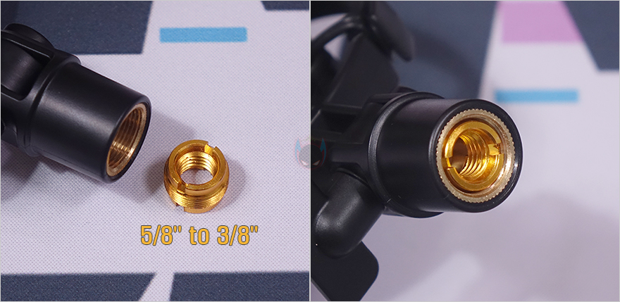 그리고, 기본 장착된 쇼크 마운트(Shock Mount)에는 스탠드 및 붐 암(Boom Arm)에 장착할 수 있게 어댑터(Adapter)도 함께 적용되어 있는데, 어댑터는 각도조절이 가능하고, 기본 연결 나사홀 규격은 5/8"지만, 5/8" to 3/8" 어댑터를 제공해 주기 때문에 3/8" 나사홀 규격으로 변경해서 장착할 수도 있습니다. 끝으로, 제공되는 USB 케이블(Cable)은 총 2.5m 길이에 기본 연결 인터페이스는 USB C to A지만, Type-A는 Type-C 변경할 수 있어서, USB C to C로도 연결할 수 있습니다.