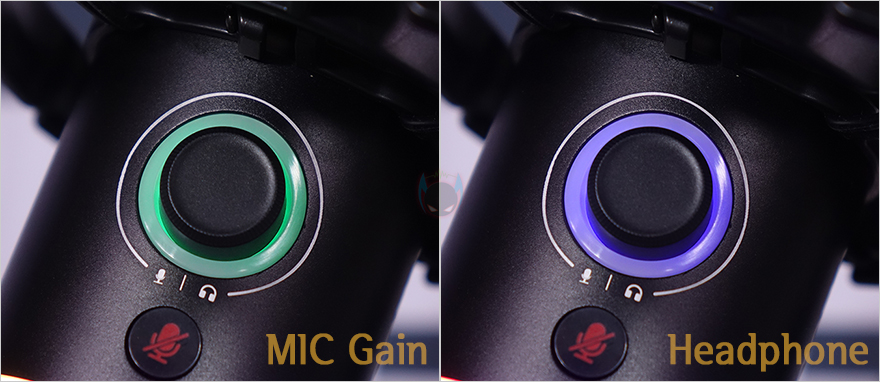 MAONO(마오노) PD200X 마이크를 직접 사용해 보면, 마이크 붐 암에 장착한 후 USB 케이블을 PC나 모바일에 연결해서 인식되면 전원이 들어오는 동시에 2 in1 디지털 노브와 캡슐과 바디 경계 부분에 LED가 점등되는 것을 확인할 수 있습니다. 경계부분에 LED는 앞서 후면에서 확인한 RGB 스위치(Switch) 버튼을 누를 때마다 단색 8가지와 RGB 색상으로 변경할 수 있으며, 노브 테두리에 LED는 앞서 언급했듯이 마이크 게인(Mic Gain) 조절일 때는 그린(Green) 색상으로, 음소거(Mute) 사용 시에는 레드(Red), 헤드폰이 연결되어 있다면 블루(Blue)색상으로 보여줍니다. 또한, 게인과 볼륨 조절에 따라 밝기도 달라지죠.