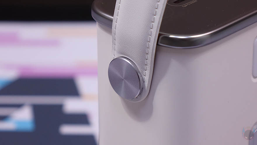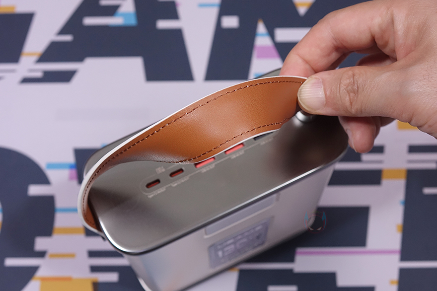 손잡이 부분(With strap for carry)은 인조가죽 재질로 바깥쪽은 제품 색상에 맞춰 적용하고 있으며, 안쪽은 갈색(Brown)입니다. 가죽 마감질 같은 부분도 품질이 나쁘지 않고, 양쪽 고정은 고리형태라 손잡이를 앞뒤로 자유롭게 넘길 수 있죠. 쉽게 말해, 이동에 있어서는 불편함이 없다는 겁니다.