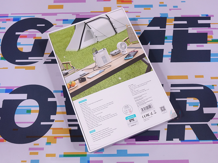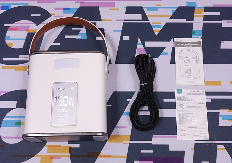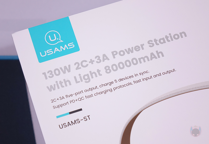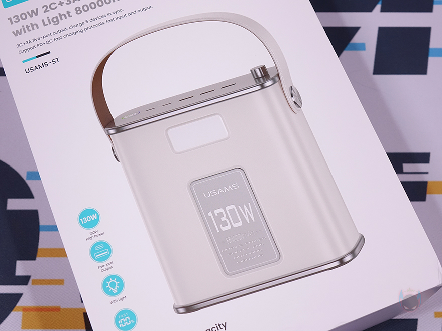 제품 박스부터 살펴보면, 박스 전체 비닐 밀봉처리가 되어 있어서 소비자입장에선 판매제품에 신뢰를 가질 수 있습니다. 박스 전면에는 모델명과 함께 제품 이미지를 확인할 수 있는데, 뒤에서 다시 언급하겠지만, USAMS-ST는 화이트(White)/블랙(Black) 2가지 색상으로 나왔으며, 모델명은 작게 표기하면서 위에 제품이름은 '130W 2C+3A Power Station with Light 80000mAh'로 상당히 깁니다. 그리고, 그 아래 특징 문구로 총 5 포트(Port)와 PD+QC 충전 둘 다 지원한다는 문구도 표기해놨죠. 물론, 제품 이미지 한쪽 아래에도 주요 특징에 반복 문구와 라이트(Light) 기능과 LED 스크린(Screen) 기능을 추가로 표기해 놨습니다.