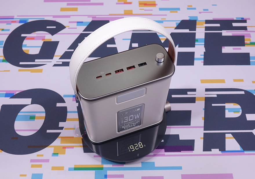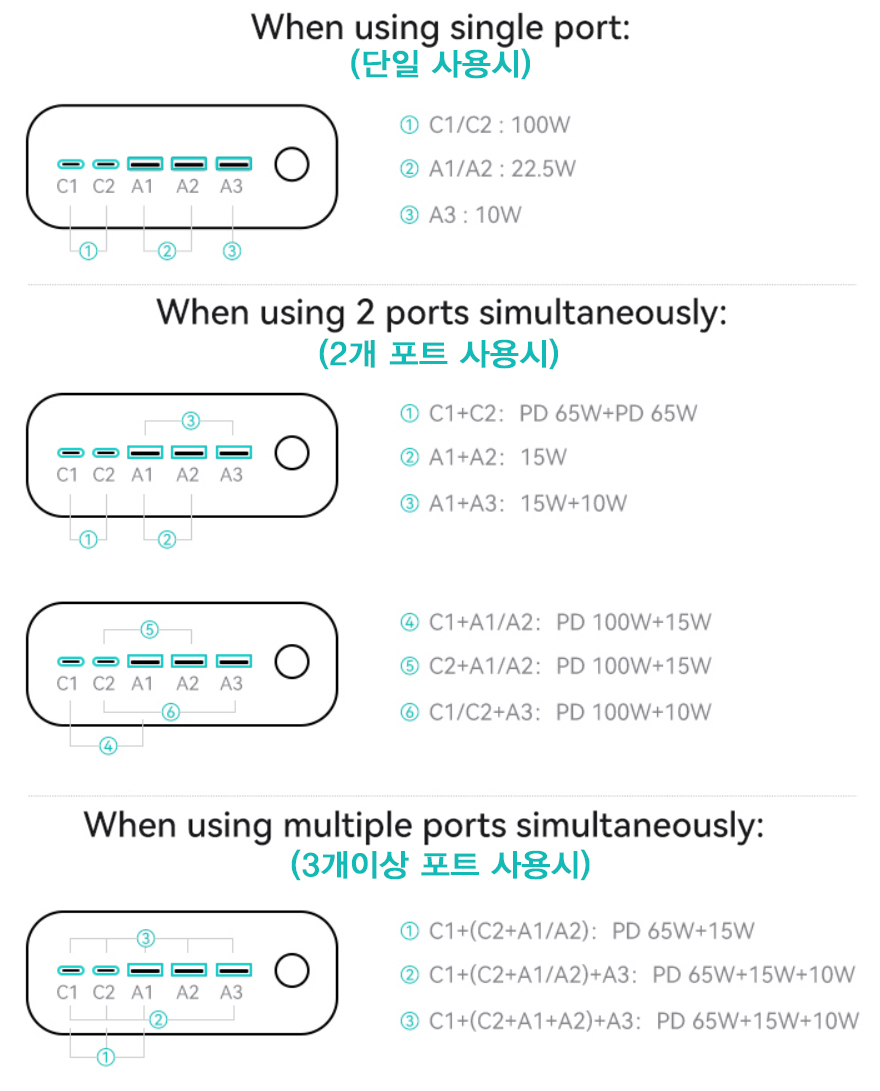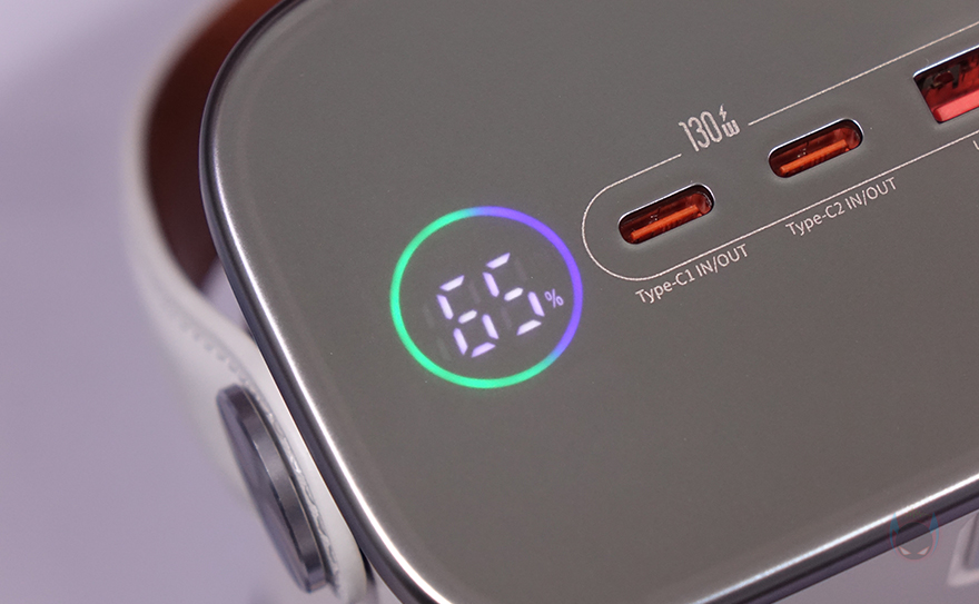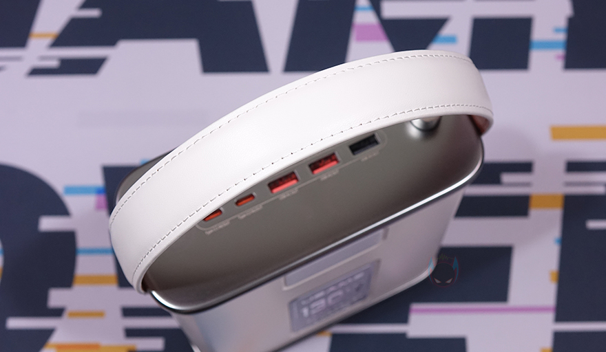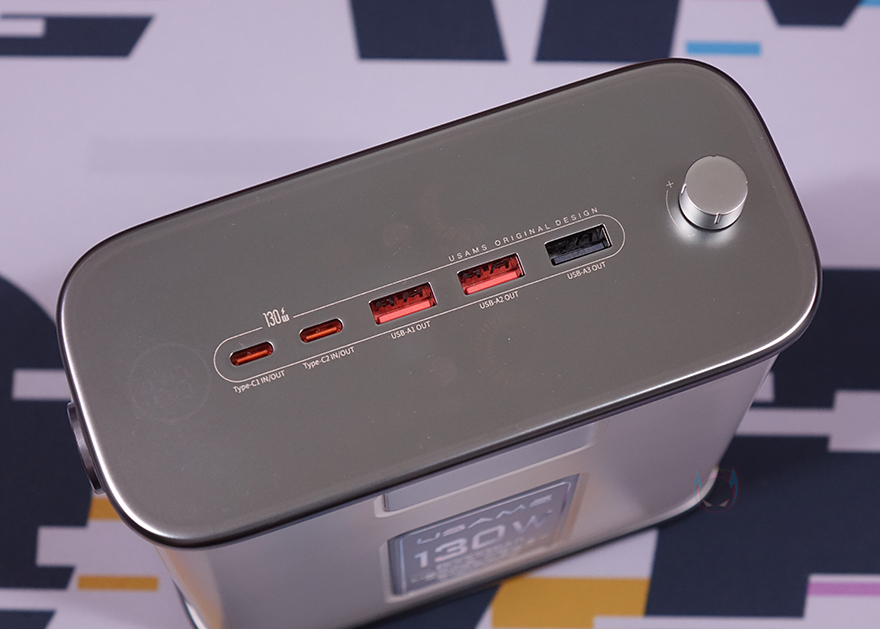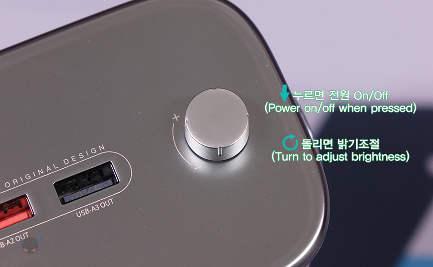 몸체 상단에는 총 5개의 USB 충전 포트와 1개의 노브(Knob)가 배치되어 있는데, 노브는 전원 On/Off와 라이트 밝기조절 기능을 가지고 있습니다. 노브를 버튼처럼 누르면 전원 On/Off가 되고, 돌리면 밝기조절이 되는 거죠. 그리고, 5개의 USB 충전포트는 2개가 Type-C, 3개가 Type-A 포트로 Type-C 포트는 입출력(Input/Output) 둘 다 지원하며, 단일(Single)로 사용했을 때 PD충전 지원으로 최대 100W까지 전력공급해 줍니다. 그리고, Type-A 포트는 모두 출력(Output) 포트로 A1/A2는 QC충전으로 단일 사용 시 22.5W 전력공급을 해주며, 나머지 A3는 10W 출력을 가졌습니다. 그리고, 포트 2개나 3개이상 사용시 Type-C 포트는 65W까지 입출력하며, Type-A는 A1/A2는 15까지, A3는 10W 그대로 유지를 합니다. 앞서 확인했듯이 몸체 후면에 사양표기를 해놨기때문에, 다중 포트 사용시 사용 전 참고하면 좋습니다.