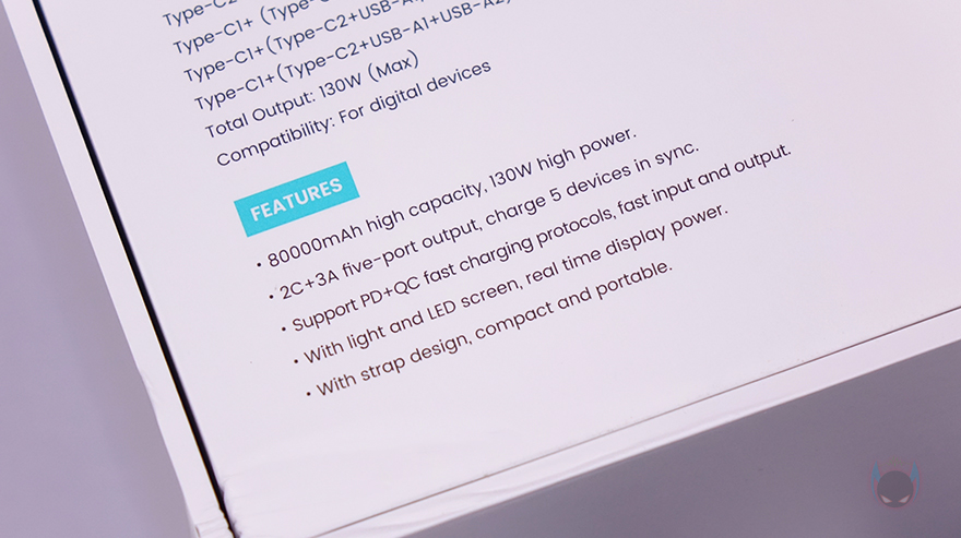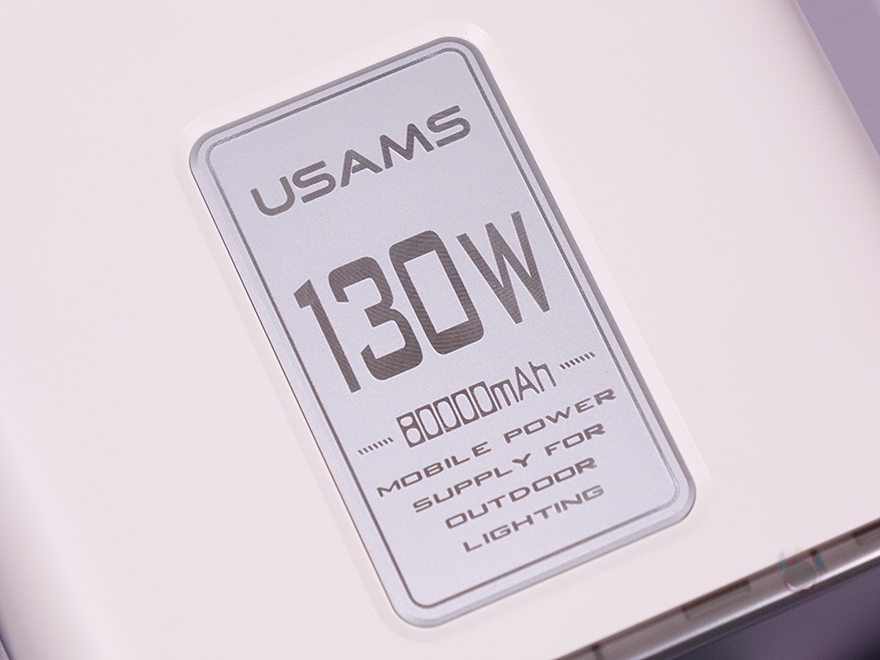 배터리가 내장되어 있는 몸체(Body) 케이스는 ABS와 PC(폴리카보네이트) 소재를 사용했으며, 전면(Front)에는 최대 전기 출력 130W와 80,000mAh 용량을 별도의 네임플레이트를 부착해 고급스럽게 표기해 놨습니다. 그리고, 윗부분에는 이 제품의 충전 외에 또 다른 기능인 라이트(Light) 기능을 적용해 놨는데, 몸체 후면에도 같은 위치로 적용해 앞뒤로 각각 라이트 기능이 작동됩니다. 그리고, 후면 아래에는 사양 표기를 해놔서, 사용하기 전에 각 포트의 전기 출력과 입력값을 알아둘 수 있죠.